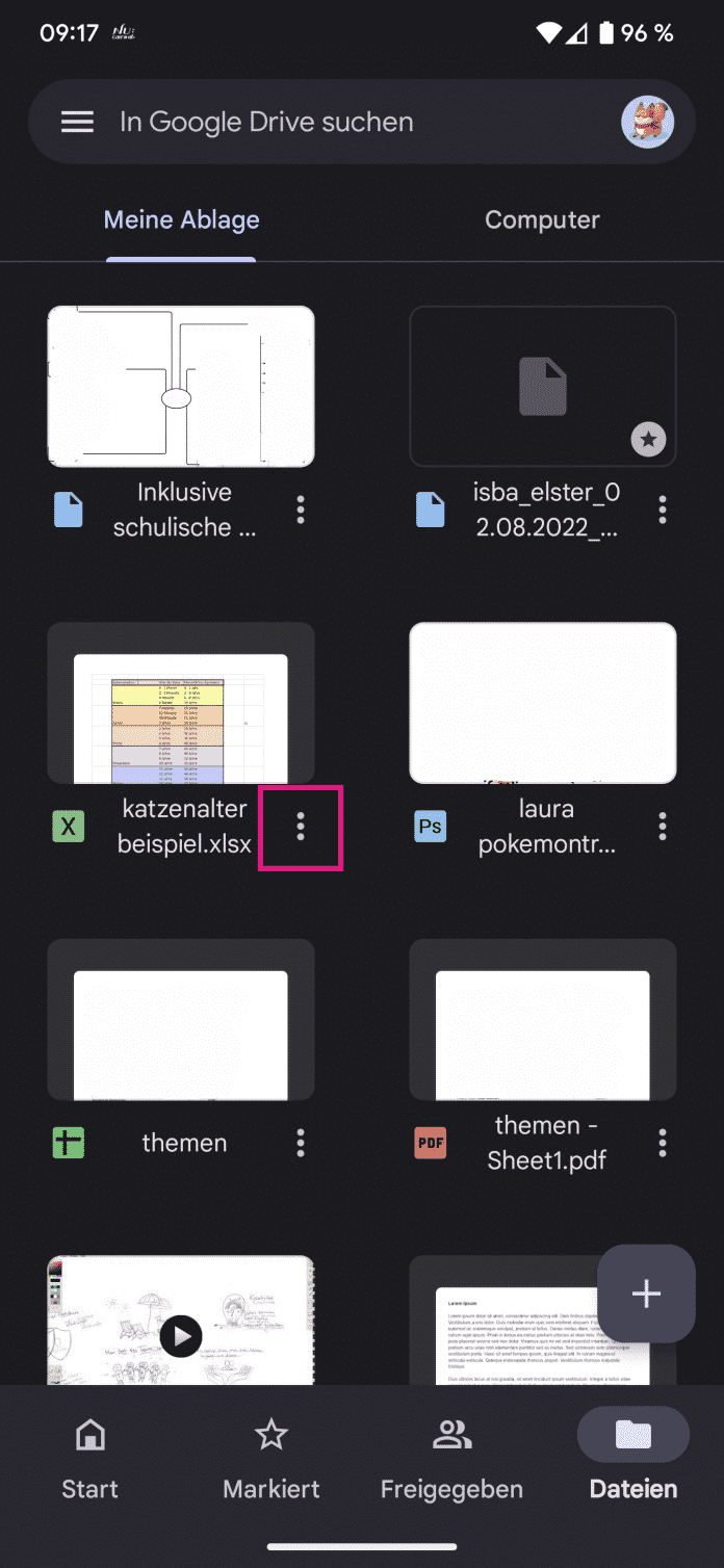 - Öffnen Sie die Google-Drive-App auf Ihrem Smartphone. Wählen Sie dort die gewünschte Datei aus und tippen Sie hinter dem Dateinamen auf das Drei-Punkt-Menü.