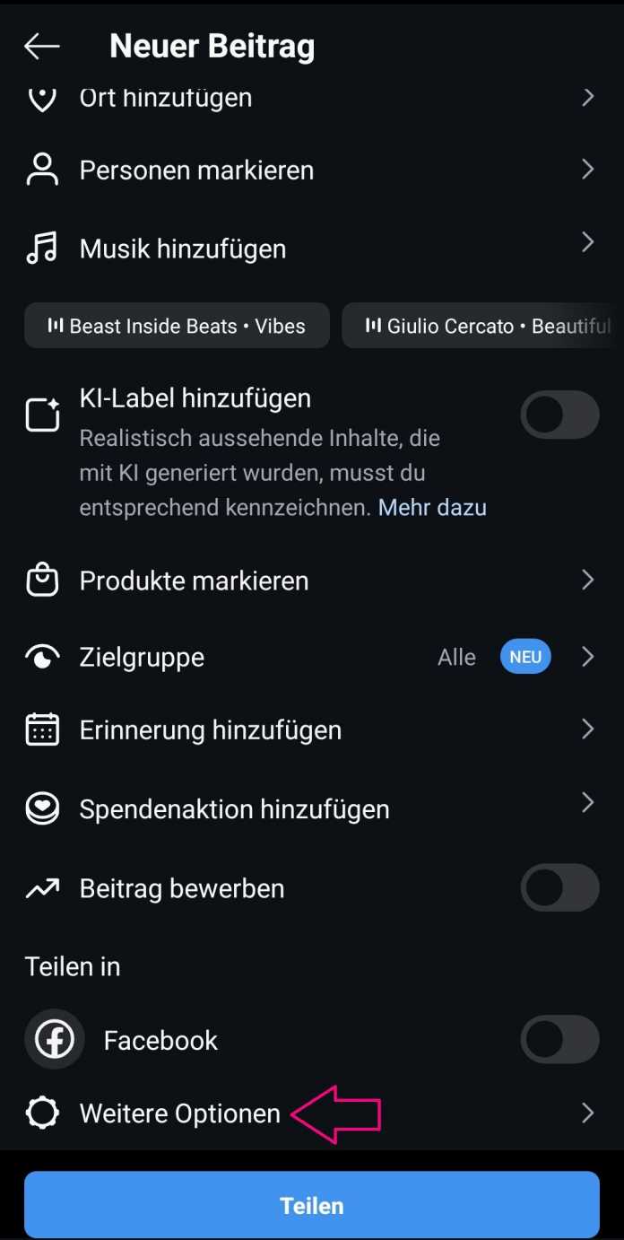 - Während der Erstellung eines neuen Beitrags tippen Sie vor dem Posten auf "Weitere Optionen" ganz unten.