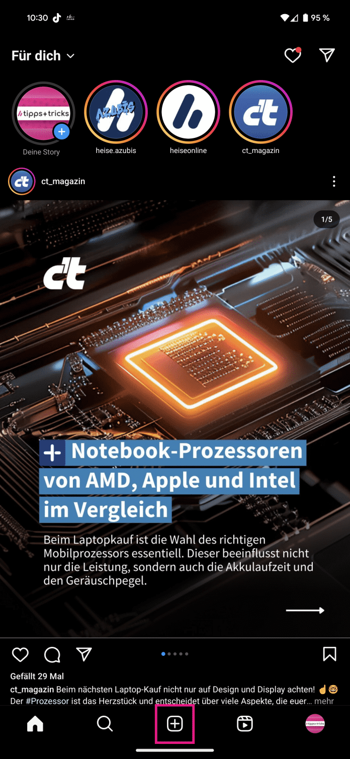 - Ă–ffnen Sie die Instagram-App und erstellen Sie dort einen neuen Post, indem Sie unten auf das Plus-Symbol tippen.