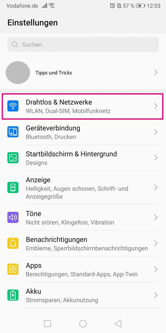 - Öffnen Sie die Einstellungen und wählen Sie dort "Drahtlos & Netzwerke" aus.