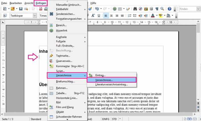 OpenOffice: Inhaltsverzeichnis einfĂĽgen (2 Bilder)