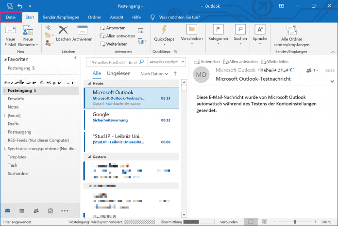 - Ă–ffnen Sie in Outlook oben links die Kategorie "Datei".