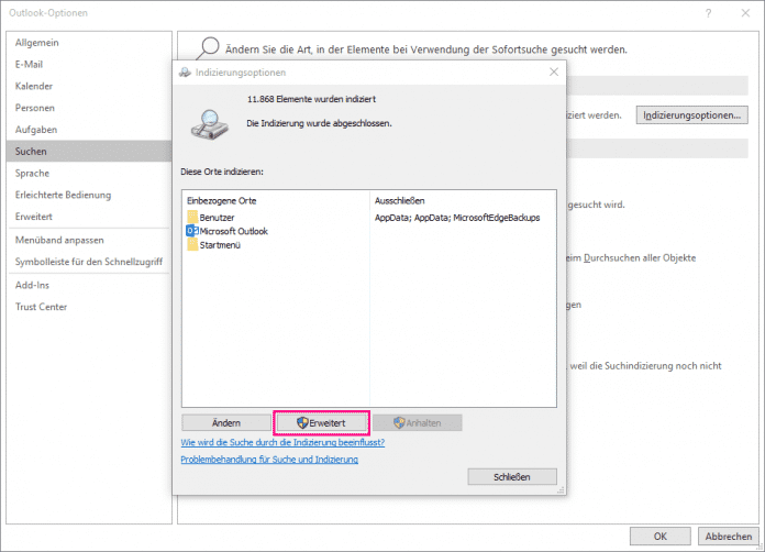 - ĂśberprĂĽfen Sie den Index von Outlook, indem Sie in Outlook ĂĽber "Datei" > "Optionen" > "Suchen" > "Indizierungsoptionen..." in der angezeigten Liste nachsehen, ob Outlook in der Liste enthalten ist.
