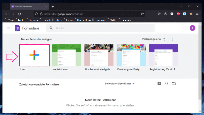 - Loggen Sie sich in Ihren Google-Account ein und öffnen Sie die Website von Google Forms.
