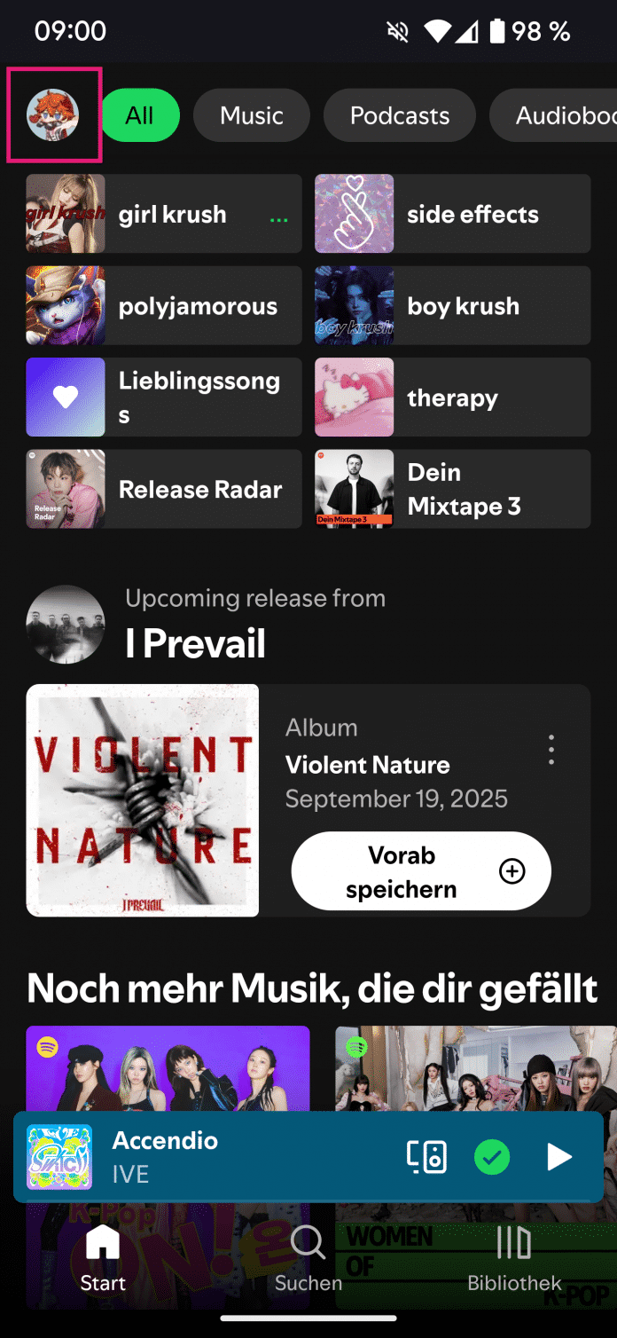 - Tippen Sie in der Spotify-App auf Ihr Profilbild oben links und wählen Sie dann "Einstellungen und Datenschutz".