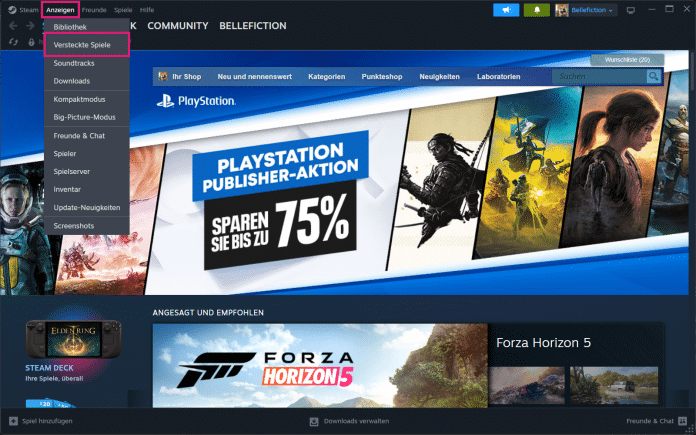 - Ă–ffnen Sie Steam und klicken Sie dort oben rechts auf "Anzeigen". Gehen Sie dann auf "Versteckte Spiele".