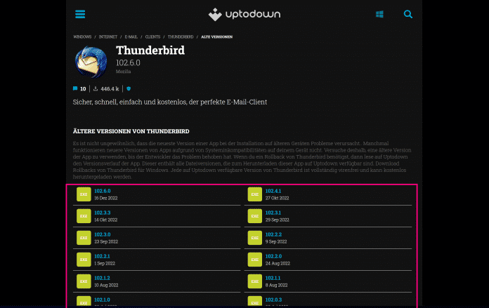 - Suchen Sie sich auf uptodown.com die passende Datei der Thunderbird-Version aus.