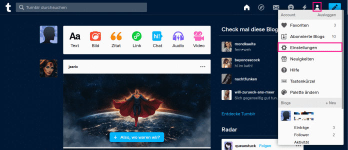 - Ă–ffnen Sie Tumblr im Browser oder in der App und rufen Sie die Einstellungen auf.