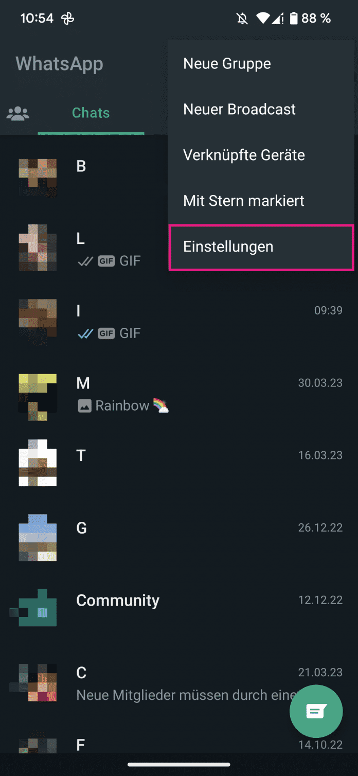 - Öffnen Sie WhatsApp auf Ihrem Smartphone. Auf einem Android-Gerät tippen Sie dann auf das Drei-Punkt-Menü in der Ecke oben rechts und anschließend auf "Einstellungen". Um auf einem iPhone zu den Einstellungen zu gelangen, tippen Sie einfach auf das Zahnrad-Symbol unten rechts.