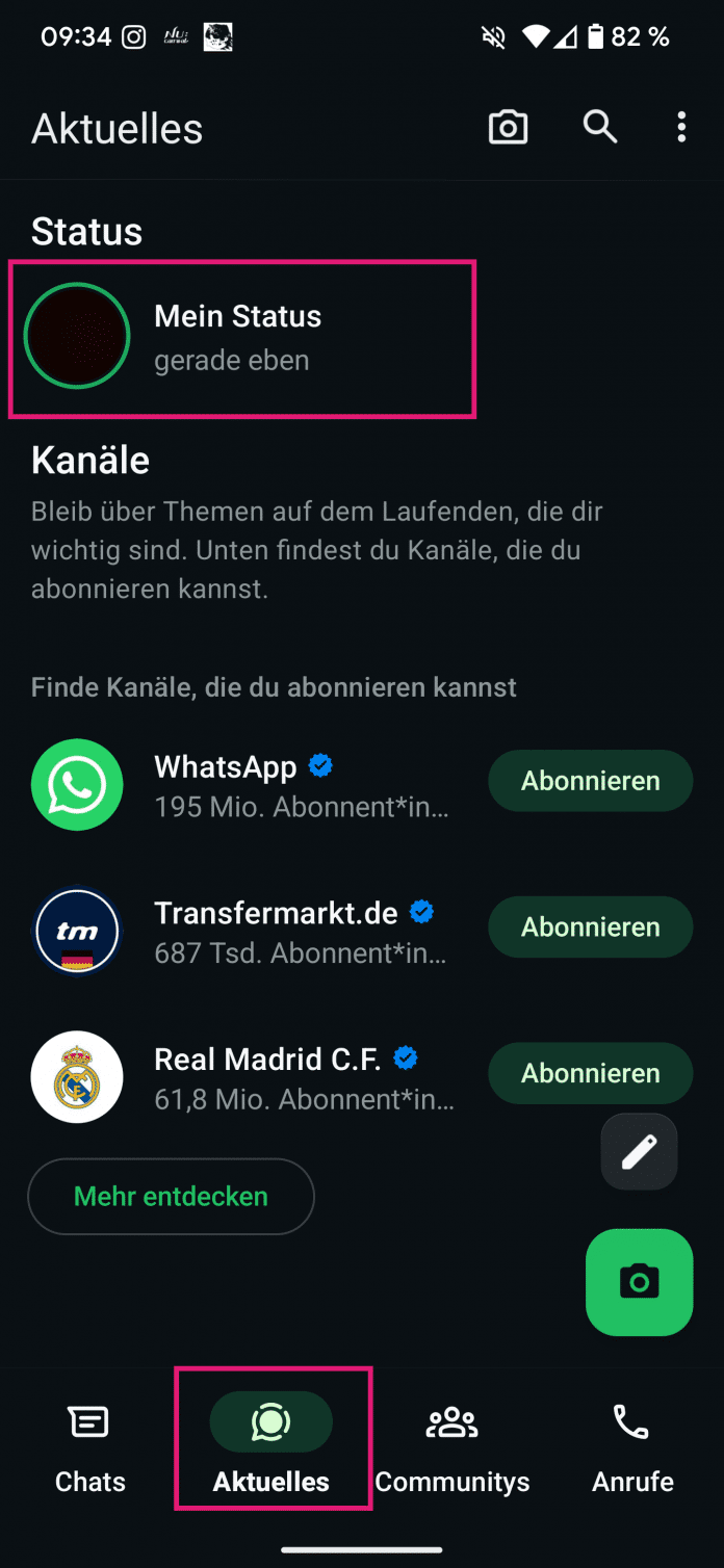 - Öffnen Sie in WhatsApp unter "Aktuelles" Ihren aktuellen Status.