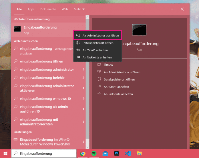 - Klicken Sie auf die Suchleiste unten links und geben Sie in das Feld "Eingabeaufforderung" ein. Machen Sie dann einen Rechtsklick auf das Ergebnis und wählen Sie aus dem Menü "Als Administrator ausführen" an.