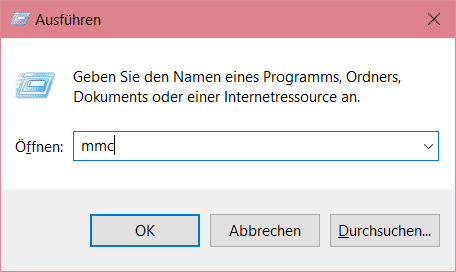 - DrĂĽcken Sie die Tastenkombination [Windows] + [R]. Geben Sie anschlieĂźend mmc in das Feld ein und drĂĽcken Sie [Enter].