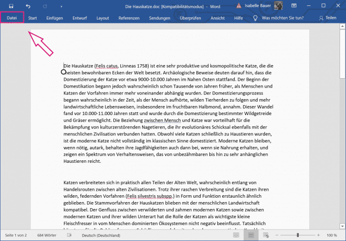 - Ă–ffnen Sie das Dokument in Word und klicken Sie oben links auf den Reiter "Datei".