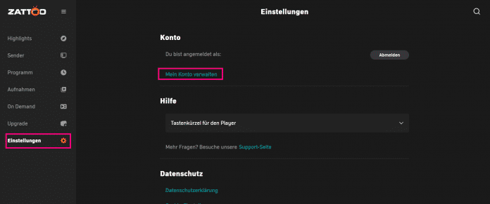 - Rufen Sie die Zattoo-Website auf. Klicken Sie links auf "Einstellungen".