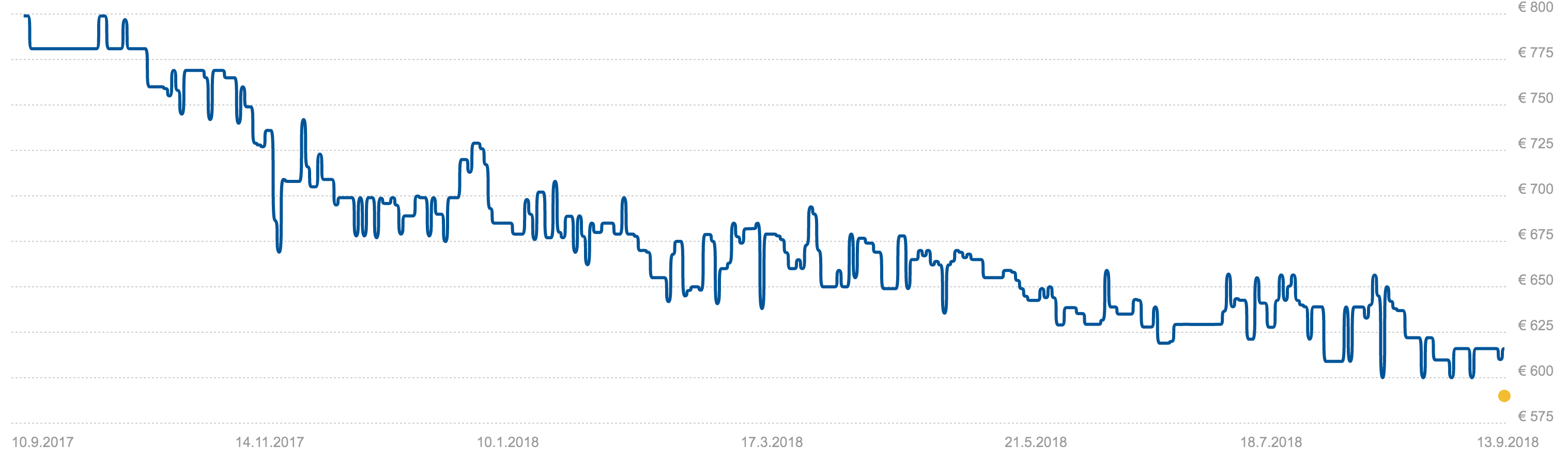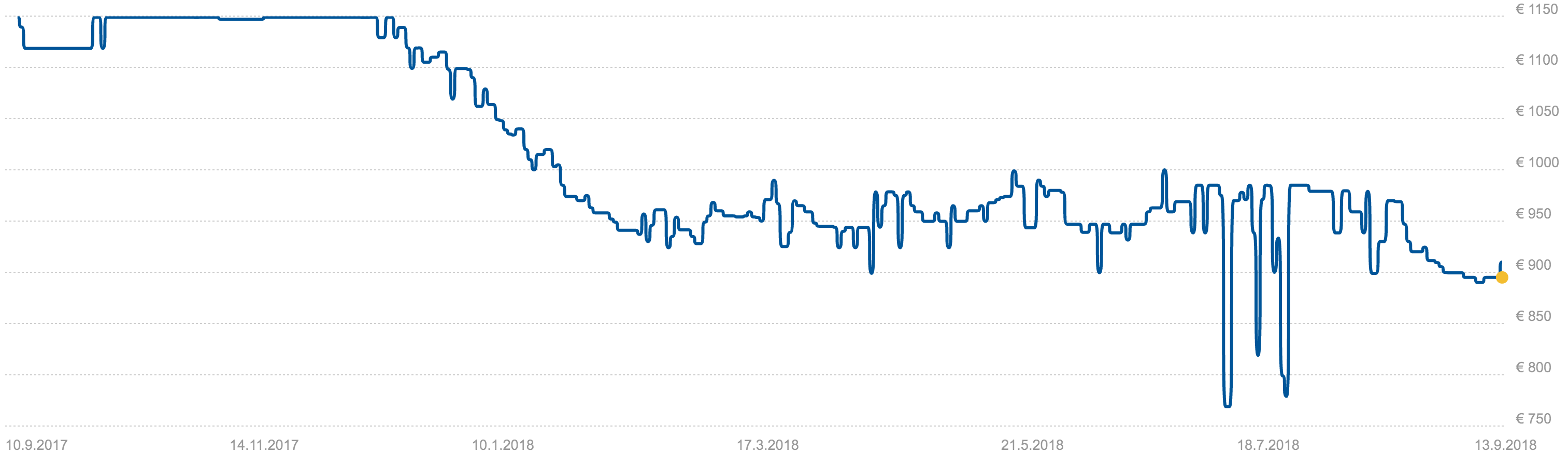 Aktuell ist das iPhone X bereits knapp 28 Prozent billiger als zu seiner Markteinführung. Statt 1319 Euro ist es aktuell ab knapp 1000 Euro zu haben. Wer darauf setzt, dass mit Verkaufsstart von iPhone Xs und iPhone Xr die Preise nochmals deutlich fallen, wird aber vermutlich enttäuscht: Zum einen lässt sich in der Preisverlaufskurve der 2016er-Modelle im September kein deutlicher Verfall herauslesen, und zum anderen ist das iPhone X den neuen Modellen optisch sehr ähnlich.