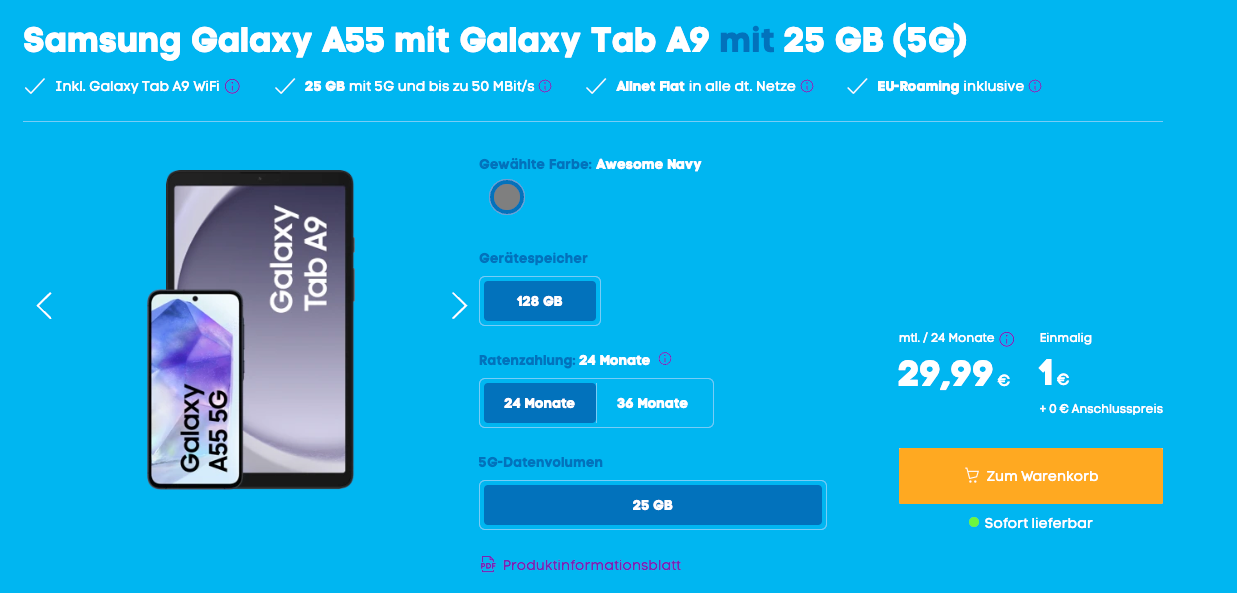 Berücksichtigt man die aktuellen Preise für das Samsung Galaxy A55 und das Galaxy Tab A9, die laut geizhals.de zusammen 547 Euro betragen, und ergänzt die Tarifkosten, zahlt man bei Einzelkauf in Summe 786,76 Euro. Wer das Bundle bei Blau erwirbt, spart 61 Euro.