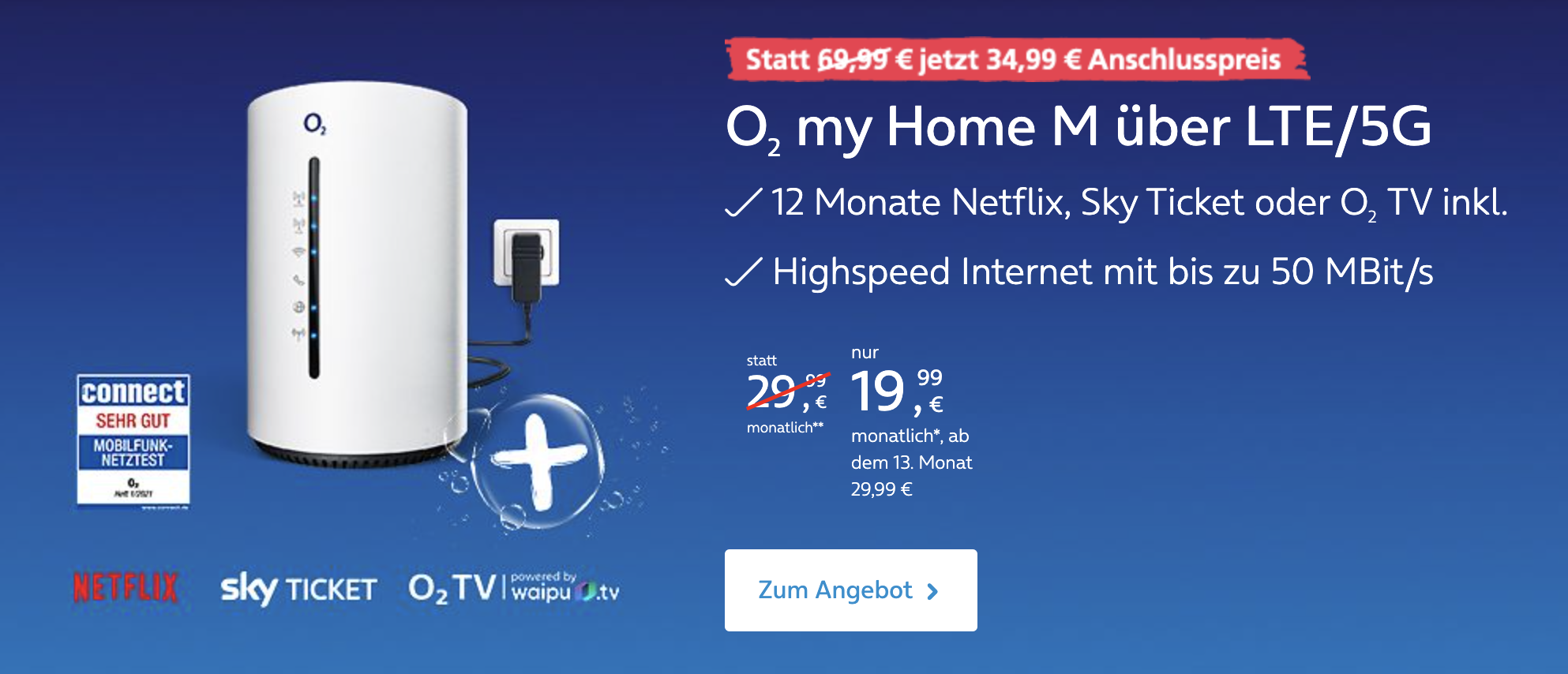 Das günstigste Paket mit unbegrenztem Inklusivdatenvolumen heißt O2 My Home M. Es bietet flottes Internet (max. 50 MBit/s Download und 10 MBit/s Upload) und man kann seine Festnetznummer portieren. Der Tarif kostet im ersten Jahr 20 statt 30 Euro im Monat. Zudem liegt die Anschlussgebühr bei nur 35 statt 70 Euro und es gibt ein Jahr Netflix, Sky Ticket oder O2 TV mit dem Angebot von Waipu.tv kostenfrei dazu. Insgesamt hat man eine Ersparnis von bis zu 335 Euro – inklusive monatlicher Ersparnis und je nachdem, welches Streaming-Angebot man dazu bucht.