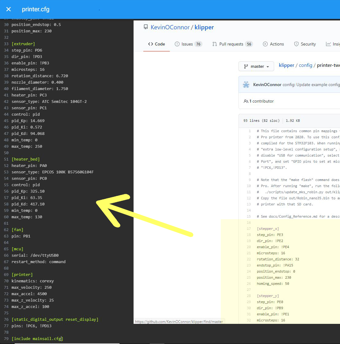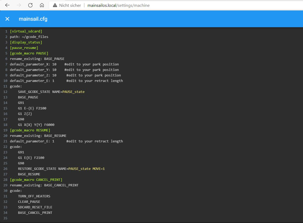 Folgende Codezeilen werden für die „mainsail.cfg“ benötigt. Diese haben wir zusätzlich als Textdatei abgespeichert und in Dropbox zum Download hinterlegt.