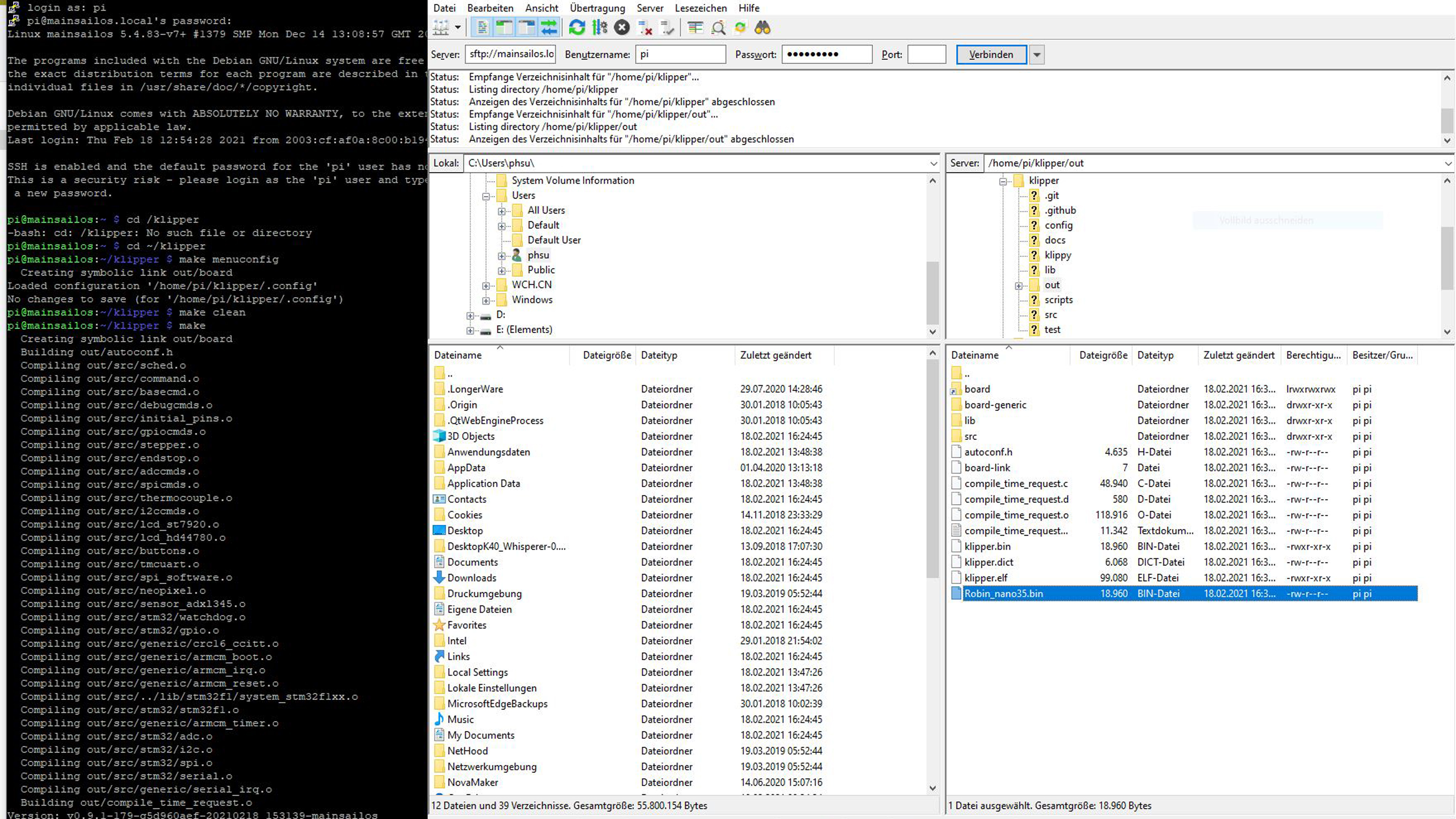 Nun navigiert man in dem rechten Fenster in den Ordner „Klipper“ und anschließend in den Ordner „out“. Das Verzeichnis heißt dementsprechend „/home/pi/klipper/out“. Hier wurde die mit dem Script überarbeitete Datei unter dem Namen „Robin_nano35.bin“ gespeichert. Bei anderen 32-Bit-Boards heißt sie schlicht „klipper.bin“. Diese Datei ziehen wir per drag&drop auf den Desktop. Im Fall, dass man kein Robin Nano Board verbaut hat und die „klipper.bin“ benutzt werden soll, muss diese vor dem nächsten Schritt noch in „firmware.bin“ umbenannt werden.
