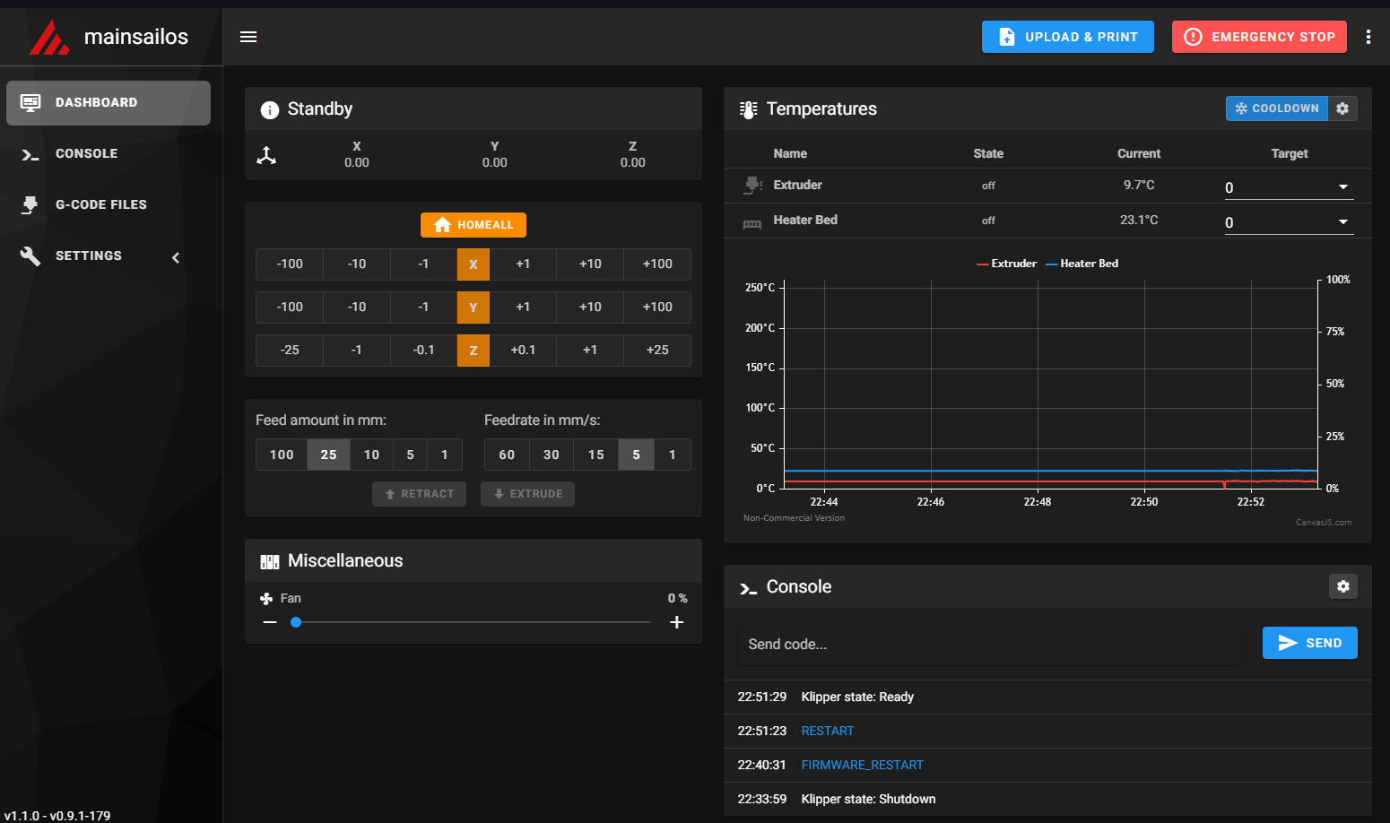 Nun sind die wichtigsten Einstellungen in MainsailOS angepasst und der Drucker ist bereit.