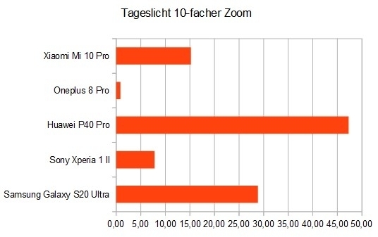 Ähnlich eindeutig siegt beim 10-fachen Zoom allerdings das P40 Pro+(Testbericht) mit echtem optischem 10-fach-Teleobjektiv vor Samsung Galaxy S20 Ultra (Testbericht) , auf dem letzten Platz landet erstmals nicht Sonys Xperia 1 II, sondern das Oneplus 8 pro, das bei Aufnahmen mit Weitwinkel- und Ultraweitwinkelaufnahmen noch ganz vorn lag.