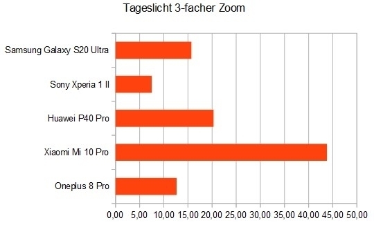 Mit den Tele-Aufnahmen werden die Ergebnisse unserer Leser immer einheitlicher. Bei dreifacher Vergrößerung gewinnt mit deutlichem Abstand Xiaomis Mi 10 Pro (Testbericht) mit seiner zweifachen optische Vergrößerung, Schlusslicht ist wieder Sony mit Digitalzoom. Auf dem zweiten Platz landet Huawei mit eigentlich perfekt an die Aufgabenstellung passendem optischem dreifach-Zoom, dessen Vorsprung auf Samsung und Onplus aber deutlich kleiner als der Vorsprung von Xiaomi auf Huawei ist.