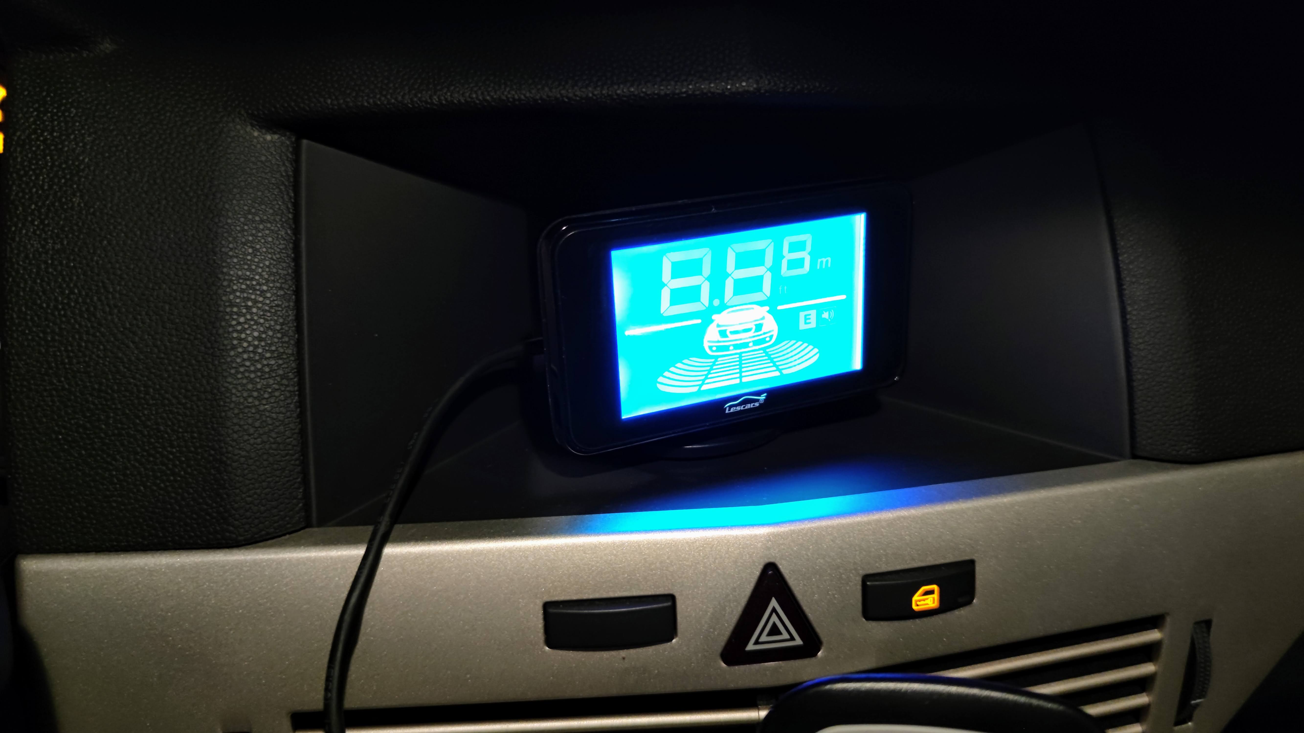 Der Signalgeber übermittelt dann mit 433.92 MHz per Funk die Signale an das kleine 3-Zoll-LCD. Dieses klebt man an das Armaturenbrett, die Stromversorgung für den Bildschirm erfolgt über den 12-Volt-Stecker im Auto. Dadurch muss man kein zusätzliches Kabel durch den Innenraum zwischen dem Signalgeber und dem Monitor im Cockpit verlegen. Der kleine Bildschirm warnt den Fahrer mit einem Piepton, wenn er sich einem Hindernis nähert. Zusätzlich gibt die Anzeige den Abstand zum Hindernis sowie die Position hinter dem Fahrzeug an.