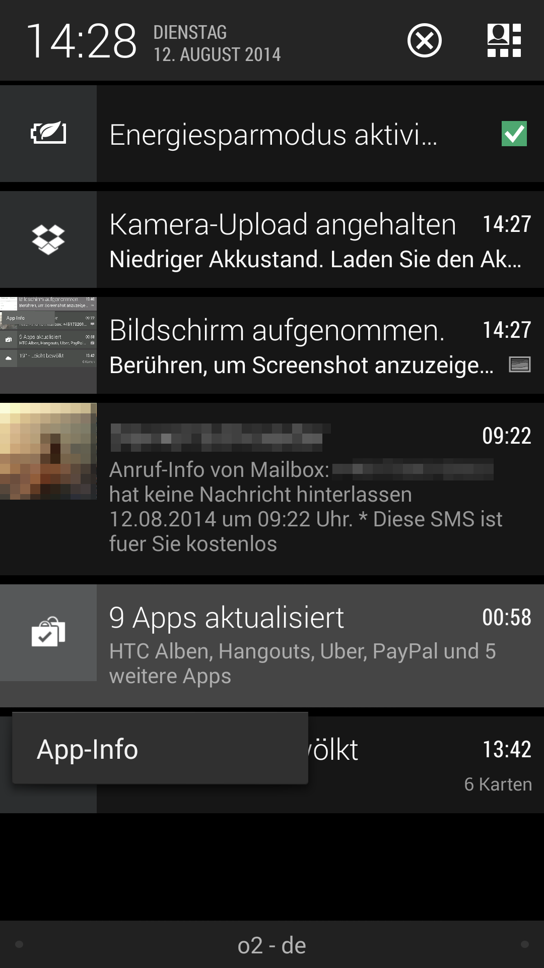 Am unkompliziertesten ist es, wenn Ihr einfach wartet, bis eine App das nächste Mal mit einer lästigen Benachrichtigung um die Ecke kommt. Dann zieht Ihr einfach die Notification Bar nach unten und haltet den Finger auf der störenden Meldung gedrückt. Es öffnet sich ein Kontext-Menü mit dem einzigen Eintrag „App Info“. Ein Fingertipp darauf springt zu den Android-System-Einstellungen der fraglichen Anwendung.