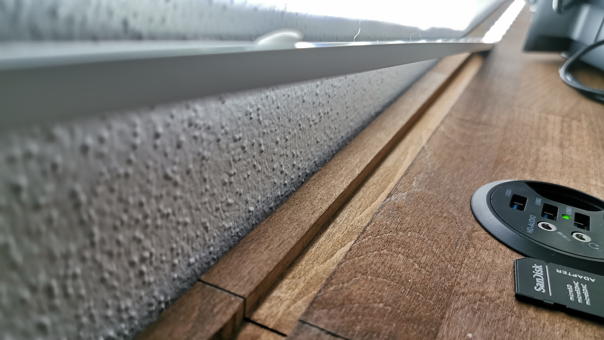 Über eine kleine Einkerbung an der Seite der Tischplatte, die leicht mit Bohrer und Bohrmaschine hergestellt werden kann, haben wir Kabel und Zigbee-Controler unter den Tisch geführt und dort nach der vollständigen Montage des Tisches befestigt.