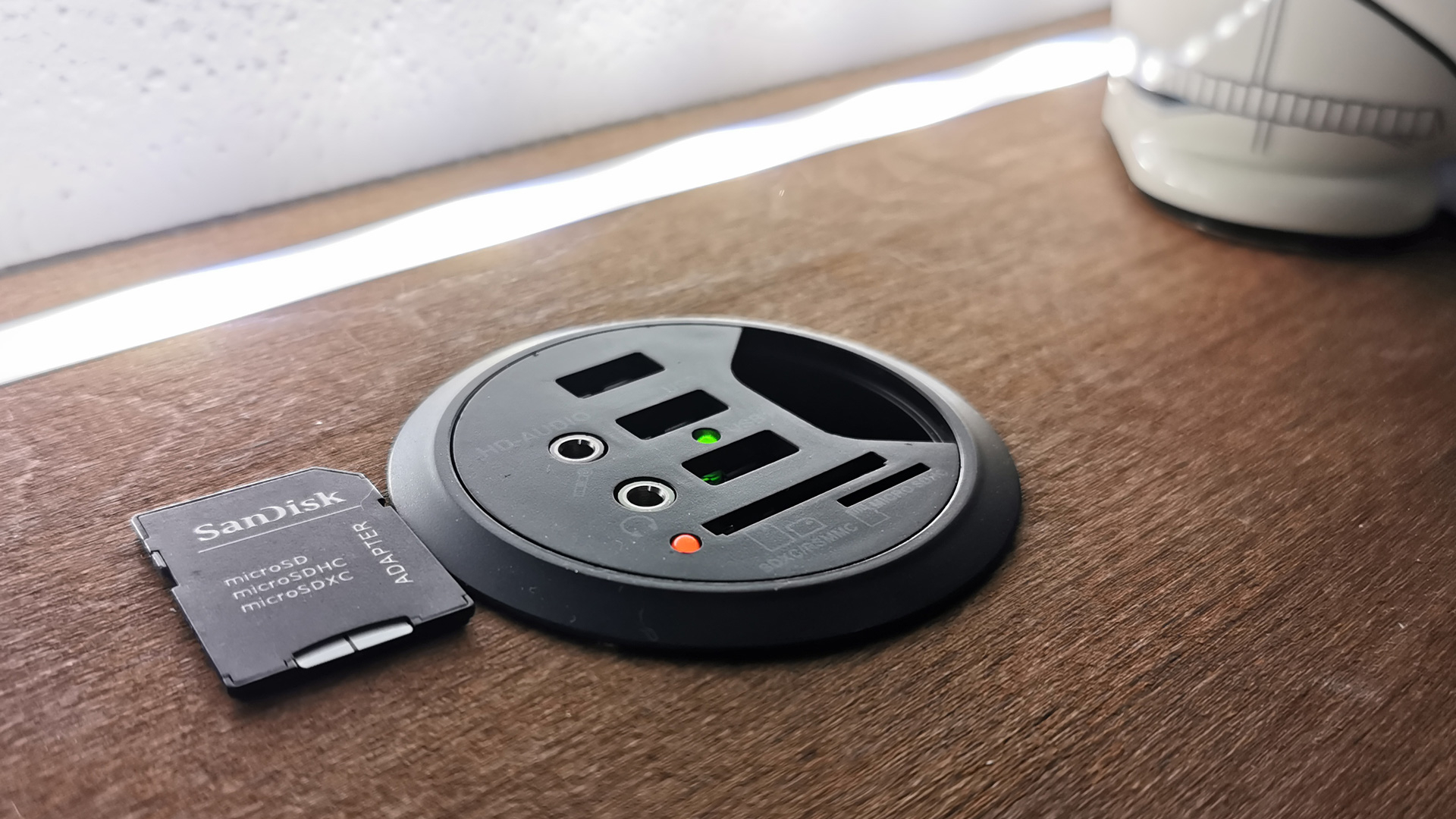 Für die passenden Löcher gibt es Aufsätze für die Bohrmaschine. Sie bieten Einstellmöglichkeiten für unterschiedliche Lochgrößen. Neben reinen Kabeldurchführungen gibt es auch kleine Hubs, die ebenfalls meist in 60-Millimeter-Löcher in der Tischplatte gesteckt werden und dann vom PC darunter USB-Anschlüsse, Kartenleser und mehr bequem in Reichweite zur Verfügung stellen. Das erspart später das ständige „unter den Schreibtisch kriechen“.