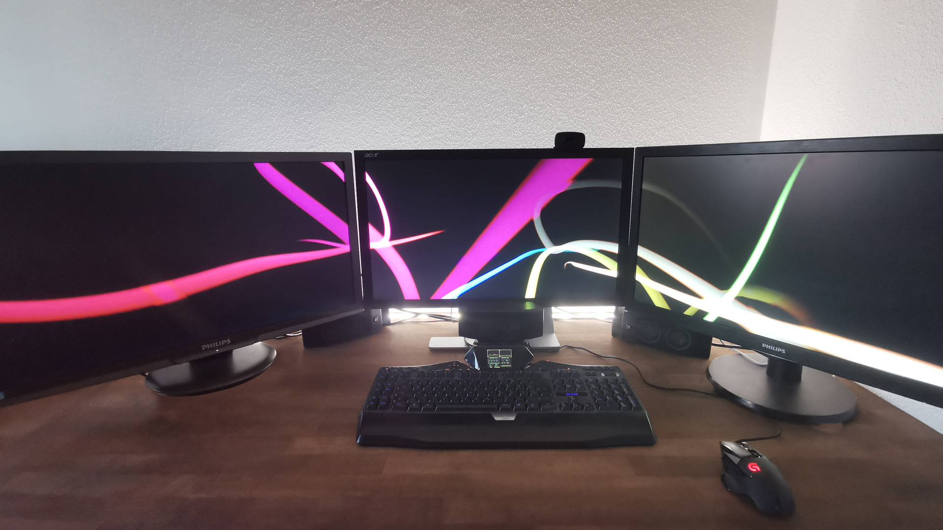 In unserem Fall reicht ein Tischbein vorn mittig und links vorne; rechts und hinten liegt die Platte auf den angebrachten Leisten an der Wand. Als Tischbeine haben wir uns übrigens für höhenverstellbare von Ikea entschieden – die sind deutlich billiger als im Baumarkt. Nachdem das Holz ausgerichtet ist, schrauben wir noch von unten durch die Leisten in die Holzplatte, um sie zu fixieren. Andernfalls könnte sie von der Wand gerissen und mitsamt der teuren Technik zu Boden gehen. Dann noch die LED-Streifen in die Alu-Profile legen, die Abdeckung darüber platzieren, die Hubs in der Tischplatte im PC anschließen – fertig.
