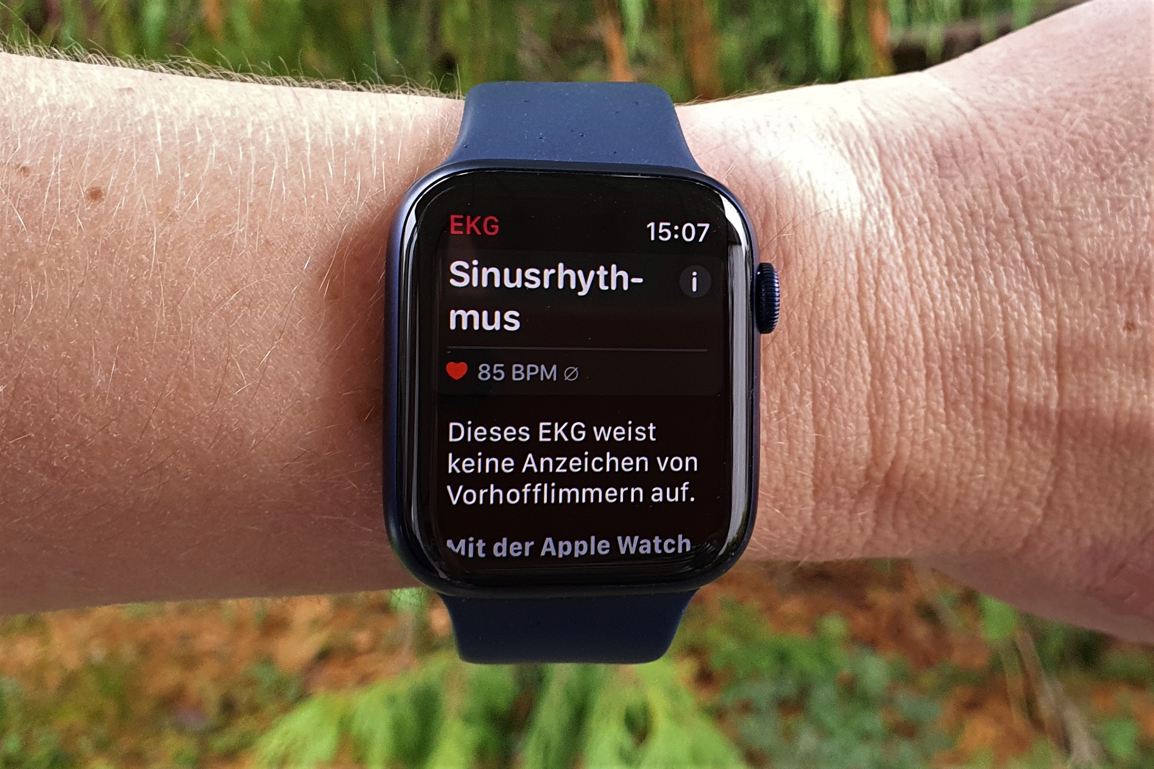 Die Aufzeichnung erfolgt bei allen Uhren über die EKG-App auf der Watch, die standardmäßig vorinstalliert ist. Zum Aufzeichnen startet man die App und legt einen Finger für 30 Sekunden auf die Krone. Eine erste Einschätzung gibt es sofort im Anschluss auf dem Display der Uhr, das ausführliche EKG inklusive Export-Funktion in ein PDF gibt es in der Health-App auf dem iPhone.