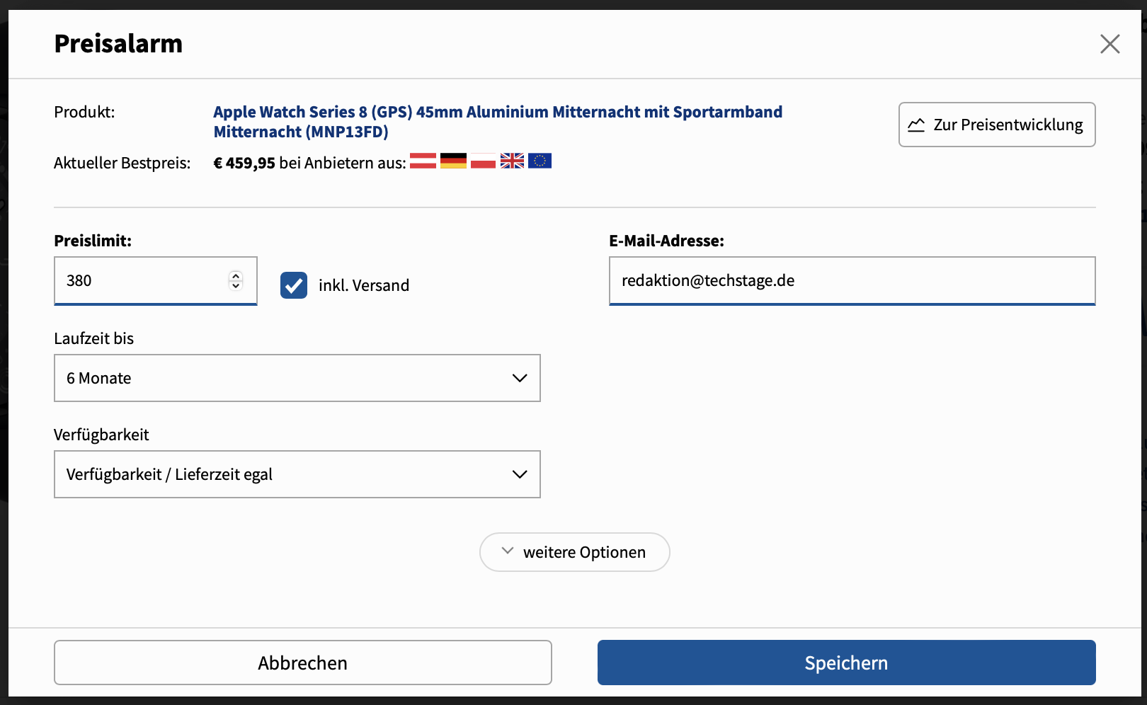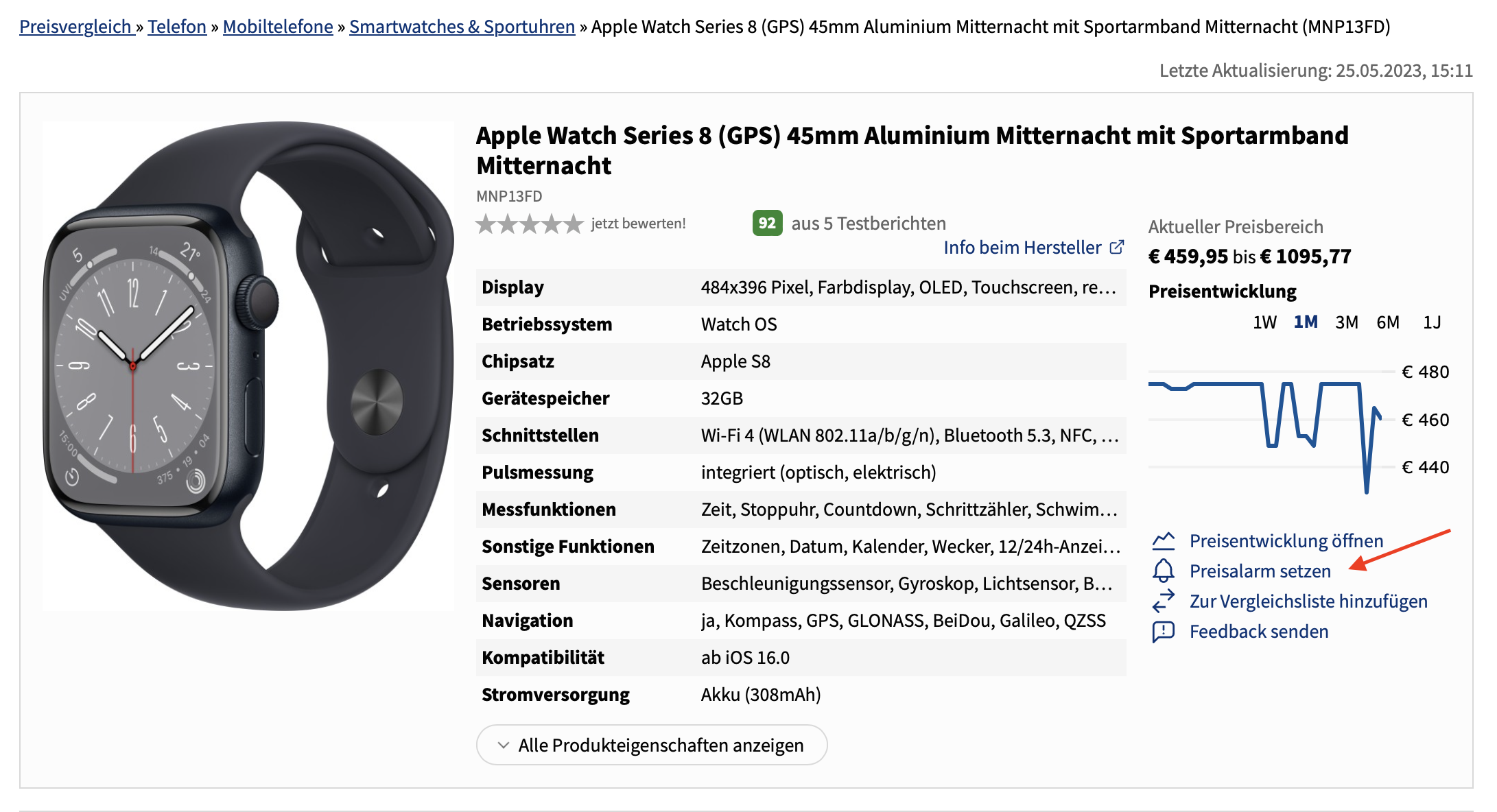Wenn die Apple Watch farblich zum iPhone passen soll, die Größe wichtig ist oder es nicht ohne LTE geht, kann man mit etwas Geduld viel Geld sparen. Wir empfehlen, für alle interessanten Varianten einen Preisalarm im Preisvergleich zu setzen. Wird der Wunschpreis erreicht, bekommt man eine E-Mail.