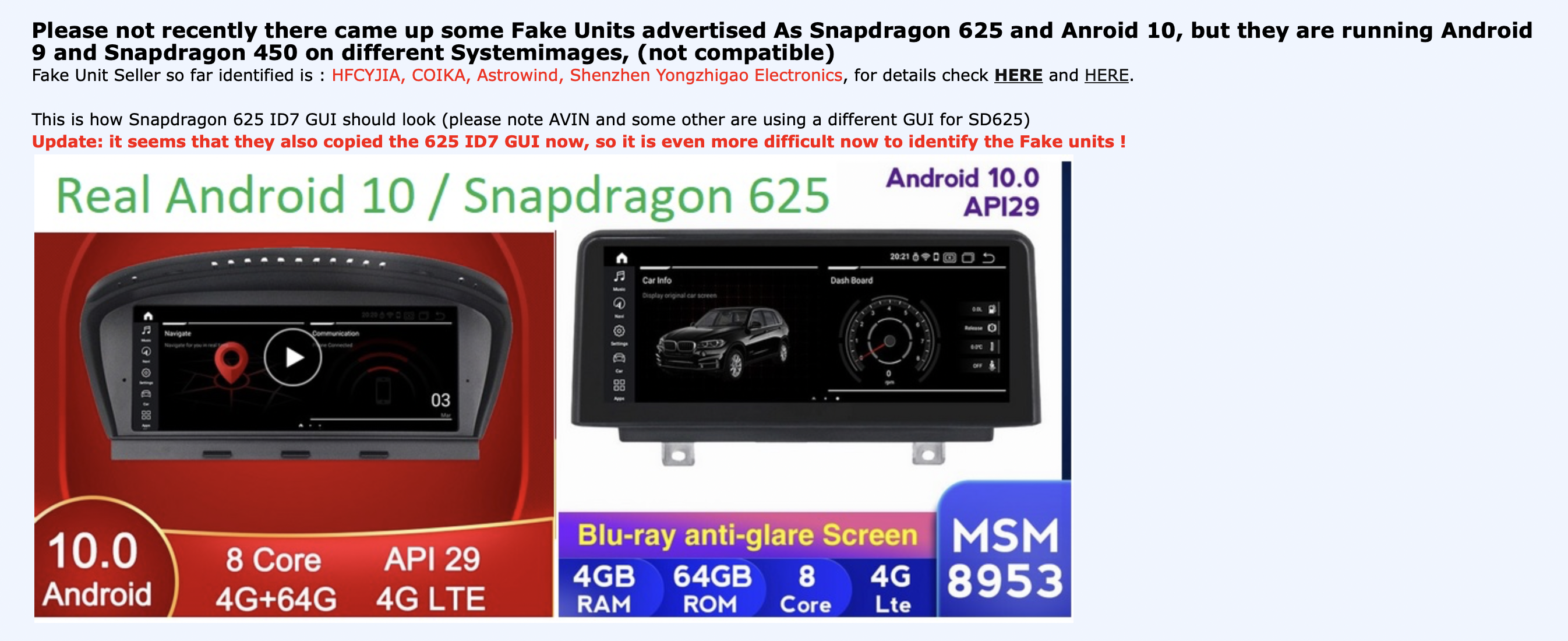 In diesem BMW-Forum gibt es beispielsweise Unterstützung, „gute“ Headunits von schlechten Nachbauten unterscheiden zu können. Zwar geht es hier konkret um den 3er der Baureihe F30, die Kriterien gelten dabei auch für die Nachrüst-Bildschirme für andere BMW-Modelle sowie für Audi und Mercedes, die technisch sehr ähnlich aufgebaut sind.