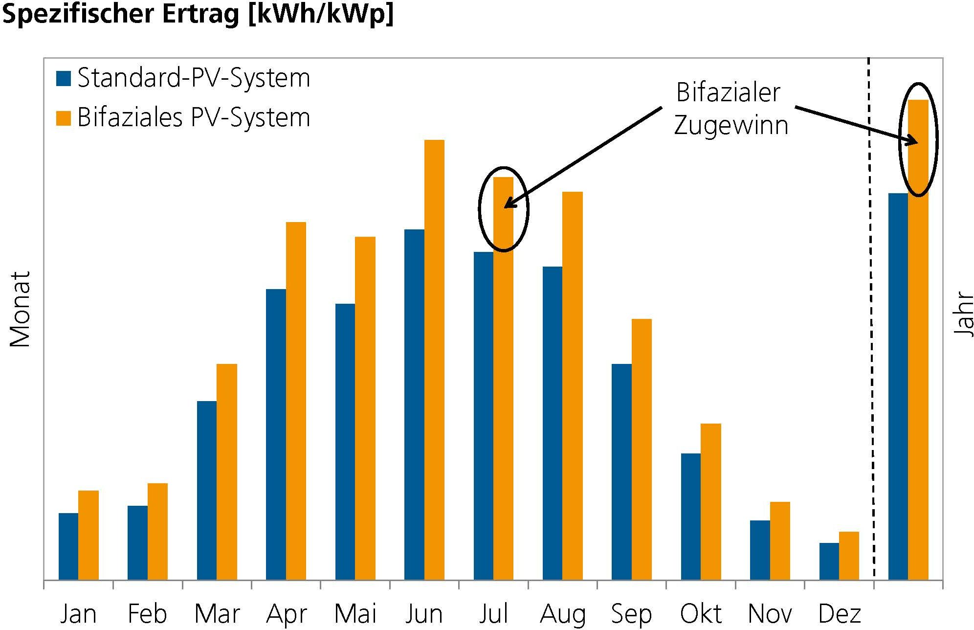 Herkömmliche monofaziale PV-Module generieren Strom aus Sonnenlicht – allerdings nur, wenn es von vorn auf die Solarzellen scheint. Bifaziale PV-Module nehmen zusätzlich auch Streulicht auf, das von hinten auf die Zellen fällt. Daher erklärt sich auch der Name: Die lateinische Vorsilbe „bi“ bedeutet „zwei“, „facies“ übersetzt „Gesicht“ – gemeint ist also ein zweigesichtiges oder zweiseitiges PV-Modul. Wie so oft bedient sich der Mensch hier Vorbildern aus der Natur, so gibt es bestimmte Pflanzenarten, deren Blätter ebenfalls zweiseitig Sonnenenergie aufnehmen können.