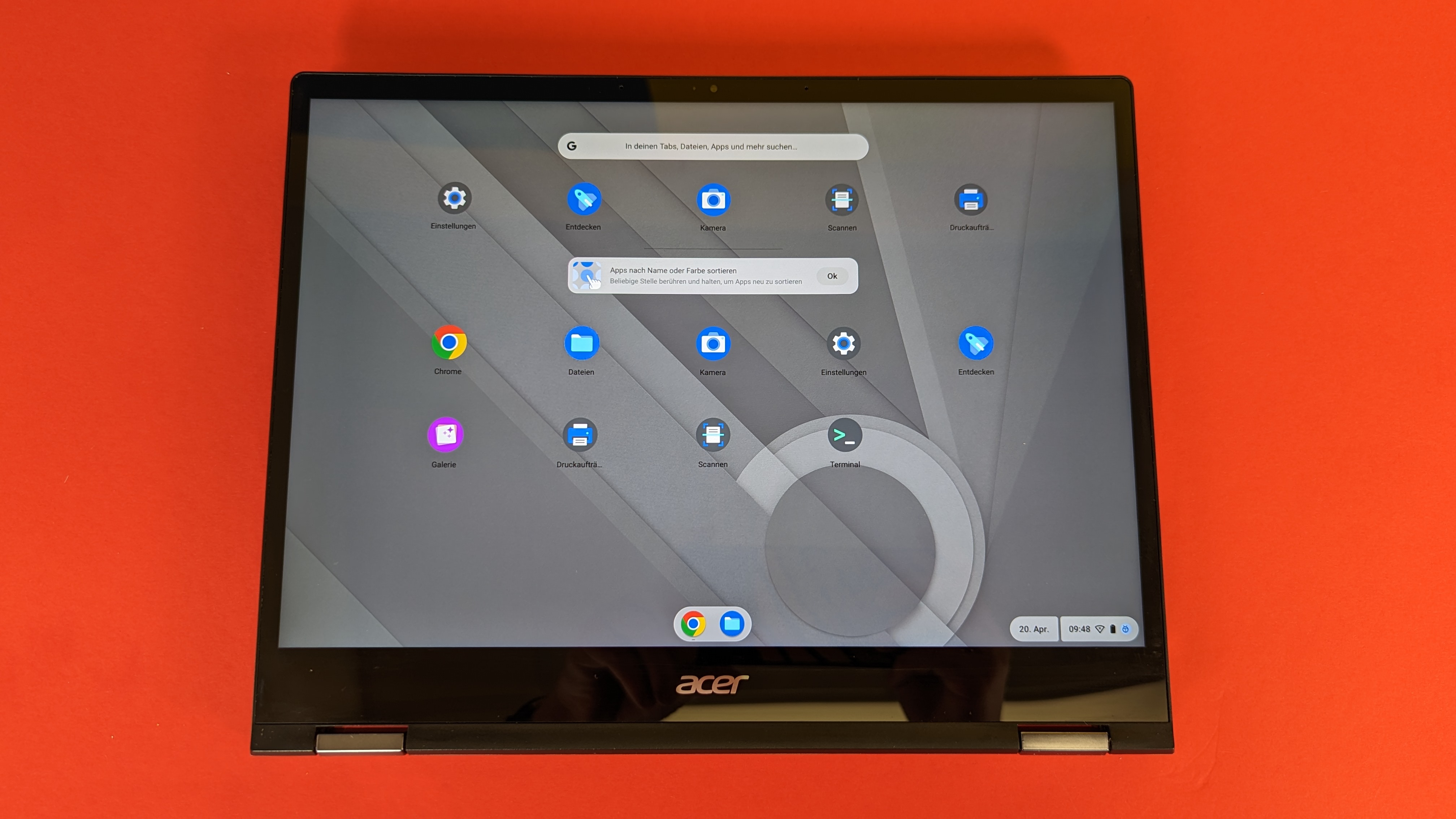 Außerdem gibt es ein Suchfeld, über das man dem Google Assistant (Themenwelt) genauer gesagt Google Home Befehle eingeben, Google-Suchen starten sowie installierte Apps und einzelne Optionen aus den Einstellungen abrufen kann. Alternativ kann man Suche und Startmenü auch über die Alles-Taste öffnen, die ähnlich wie die Windows-Taste funktioniert, aber an der Stelle der Feststell-Taste positioniert ist. Einen Desktop, auf dem Dateien und Programme abgelegt werden, gibt es nicht – hier wird nur das gewählte Hintergrundbild angezeigt.