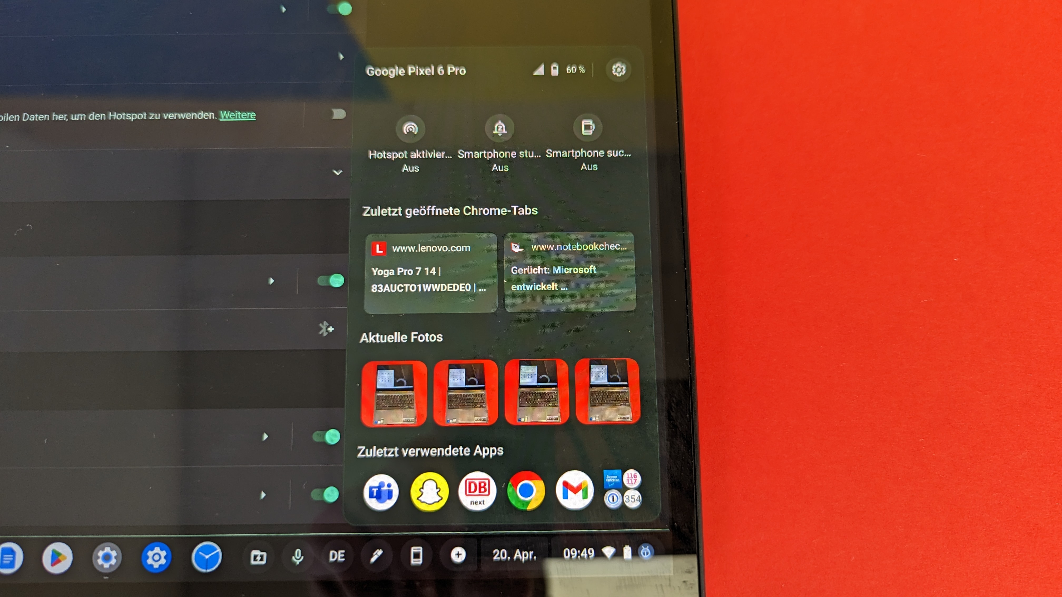 Daneben gibt es Funktionen, wie das Phone Hub, mit dem man auf ein Android-Smartphone zugreifen kann, das mit dem Account verbunden ist. Hierüber kann man das Handy stummschalten oder einen Hotspot aktivieren. Außerdem sieht man die letzten vier aufgenommenen Fotos, wie auch die beiden zuletzt geöffneten Browser-Links. Ein neues, wie starkes Feature hat Google ganz frisch als Beta freigegeben: Apps vom Android-Smartphone auf das Chromebook zu streamen. Die Funktion wird über das Phone Hub abgerufen und auch in dessen Einstellungen aktiviert.