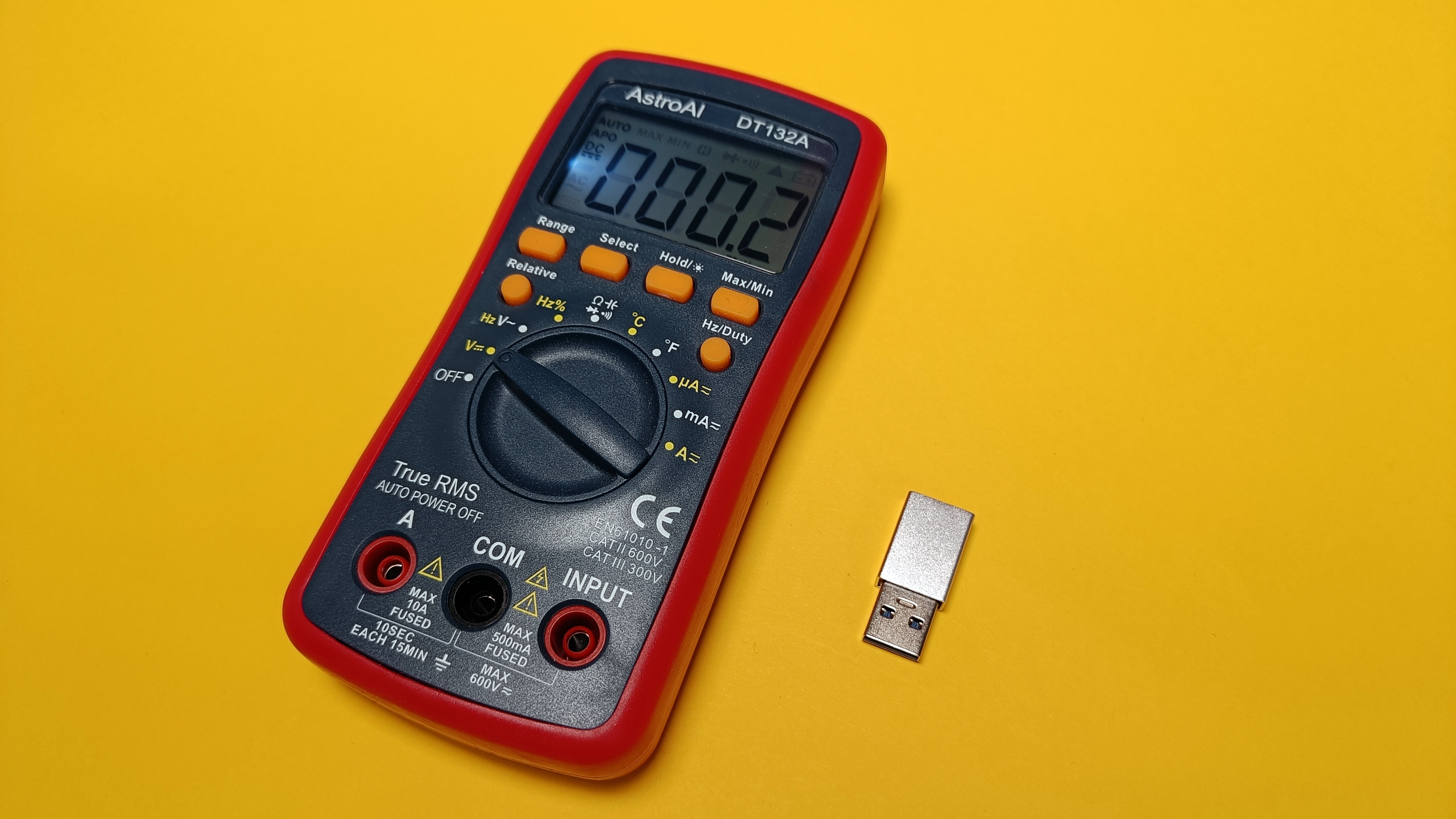 Weiter geht es mit dem Astroai DT132A aus unserem Reaktionsfundus für 25 Euro (oder 20 Euro für Prime-Mitglieder) in sehr klassischem Design mit Drehregler. Das Gerät steckt in einer schützenden Gummihülle und hat einen ausklappbaren Aufsteller auf der Gehäuserückseite. Es misst Strom, Spannung, Widerstand, Durchgang, Kapazität, Frequenz und Temperatur und ist somit das am rudimentärsten ausgestattetes Gerät im Testfeld.