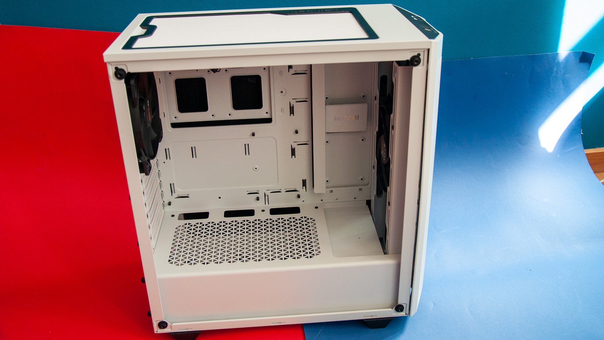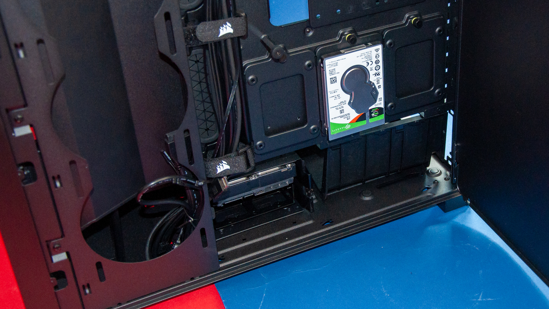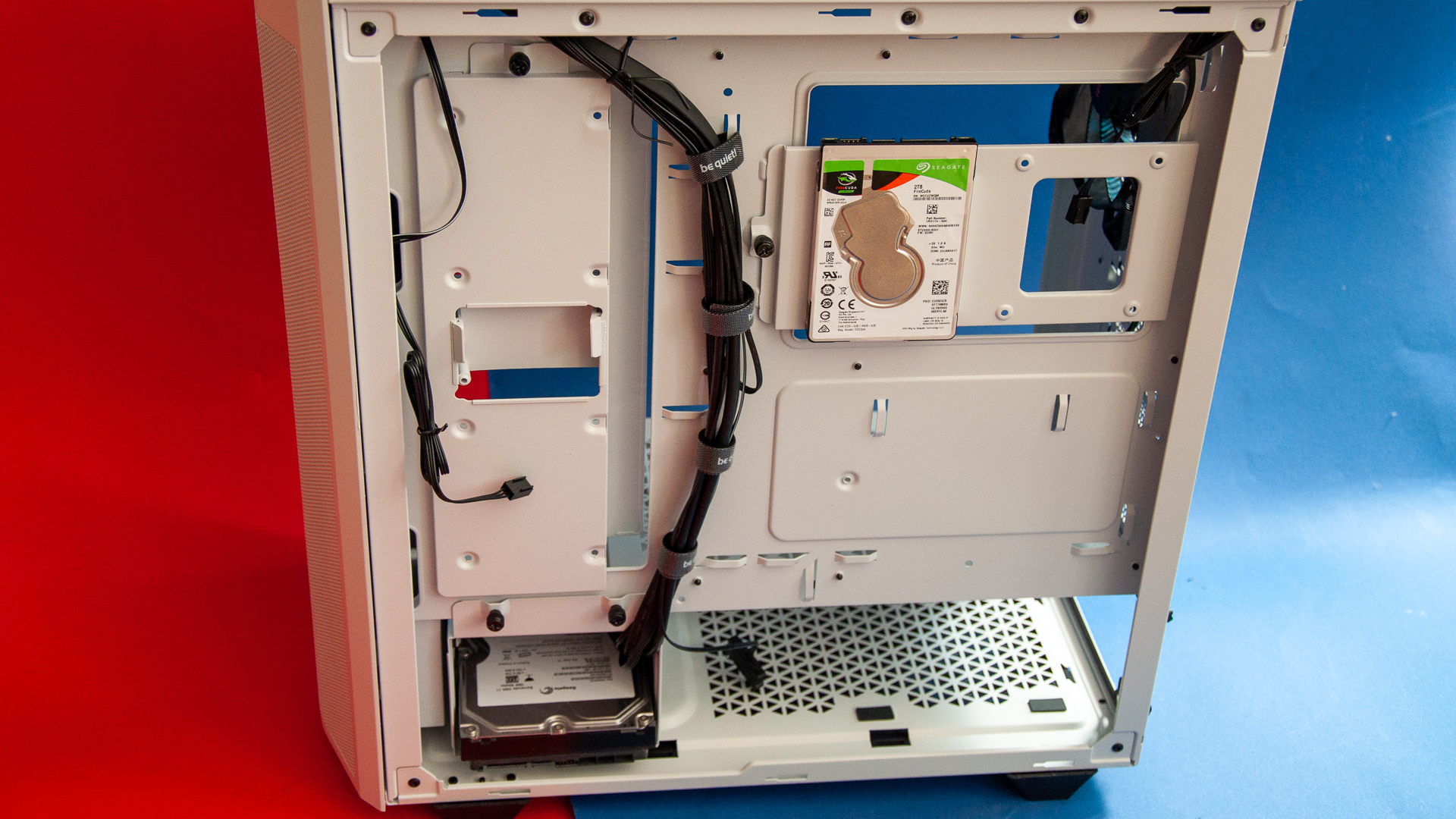 Noch deutlicher wird es, wenn man die Seitenverkleidungen (bei Corsair und Be Quiet jeweils aus Glas) abnimmt. Das IT-6865 ist spartanisch ausgestattet und bietet alles Notwendige, um ein Mainboard, Festplatten, Netzteil und Co einzubauen – aber nicht mehr. Beim Pure Base 500DX und beim 5000D merkt man, dass man Komfort und Design mit bezahlt. Ein konkretes Beispiel ist etwa, dass bei beiden das Netzteil in einem vom Mainboard getrennten Bereich sitzt. Zusätzlich verschwinden Laufwerk in den Unterbau. Für Festplatten gibt es einen Käfig, in den jeweils zwei 3,5-Platten passen. SSDs werden an die Rückseite der Mainboard-Halterung geschraubt.