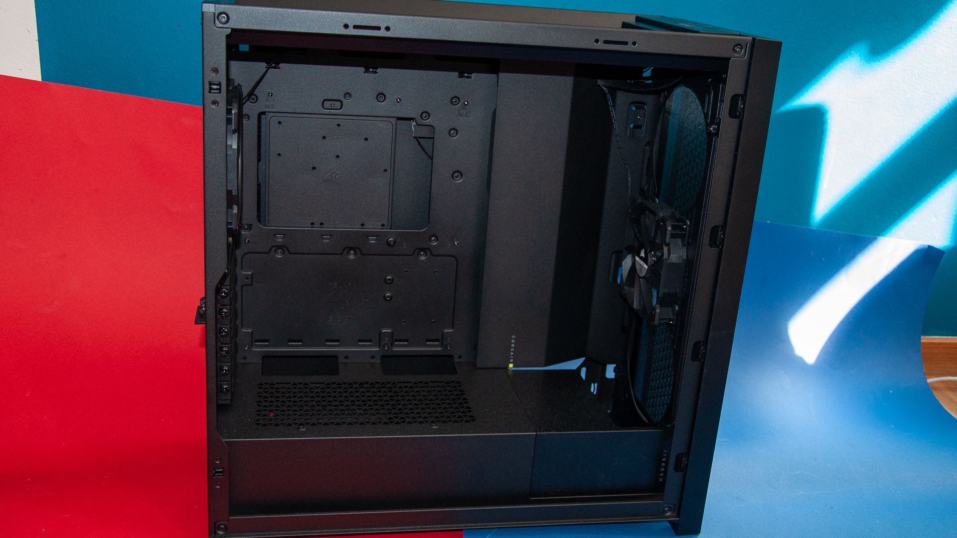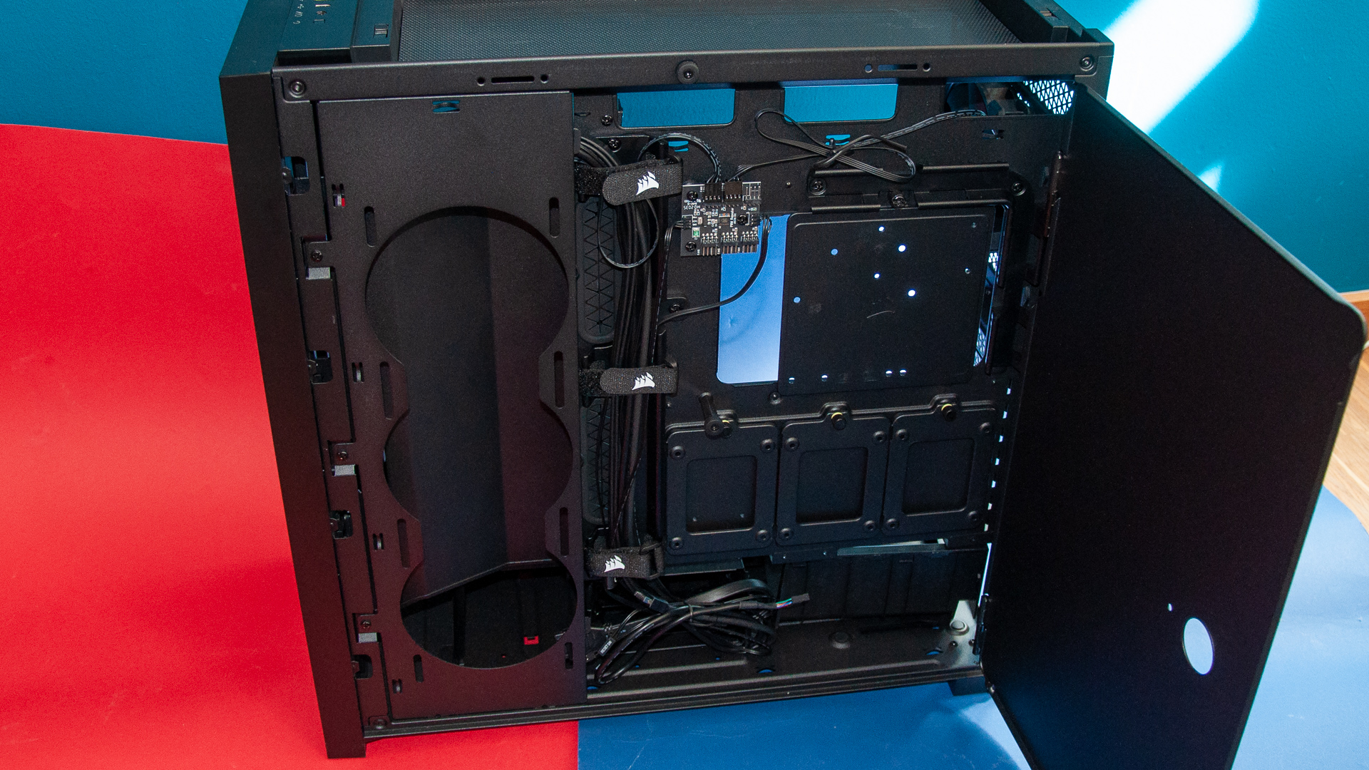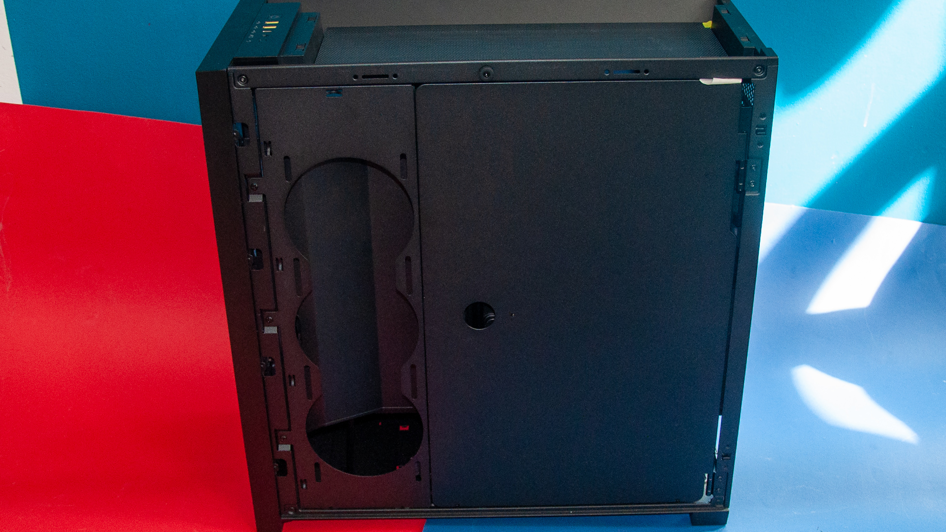 Noch deutlicher wird es, wenn man die Seitenverkleidungen (bei Corsair und Be Quiet jeweils aus Glas) abnimmt. Das IT-6865 ist spartanisch ausgestattet und bietet alles Notwendige, um ein Mainboard, Festplatten, Netzteil und Co einzubauen – aber nicht mehr. Beim Pure Base 500DX und beim 5000D merkt man, dass man Komfort und Design mit bezahlt. Ein konkretes Beispiel ist etwa, dass bei beiden das Netzteil in einem vom Mainboard getrennten Bereich sitzt. Zusätzlich verschwinden Laufwerk in den Unterbau. Für Festplatten gibt es einen Käfig, in den jeweils zwei 3,5-Platten passen. SSDs werden an die Rückseite der Mainboard-Halterung geschraubt.