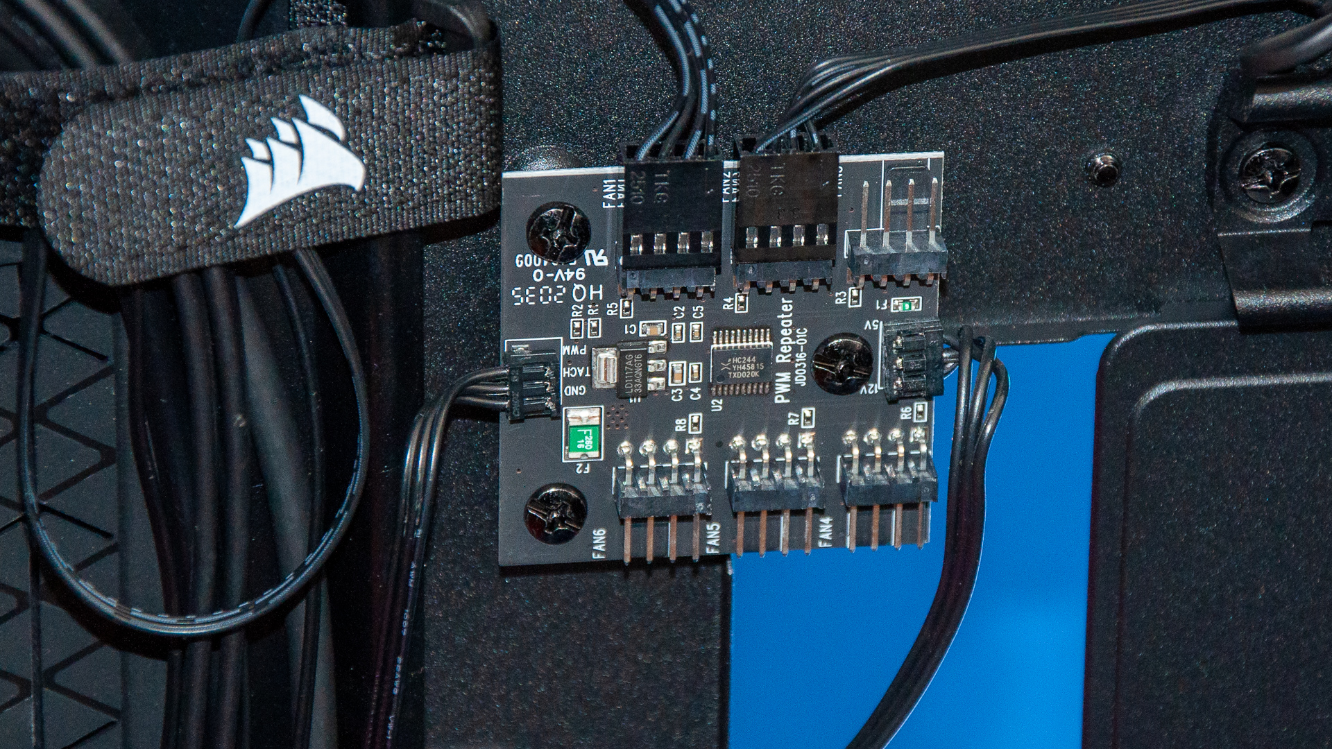 Wer so etwas vernünftig aufsetzen möchte, der kauft eine dedizierte Steuerungseinheit, welche die LEDs zentral steuert und einheitliche Lichteffekte ermöglicht. Systeme mit integrierten LEDs lassen sich zudem recht einfach erweitern. Unser Ratgeber Licht im PC zeigt, wie das mit Komponenten von Corsair oder Evnbetter funktioniert. Privat setzen wir auf das Icue-System von Corsair und haben uns mit den Corsair LL120 passende bunte Lüfter gekauft. Zur Steuerung verbindet man alle Lüfter mit der sogenannten Lighting Node Pro, die ihrerseits mit dem Mainboard verbunden ist.