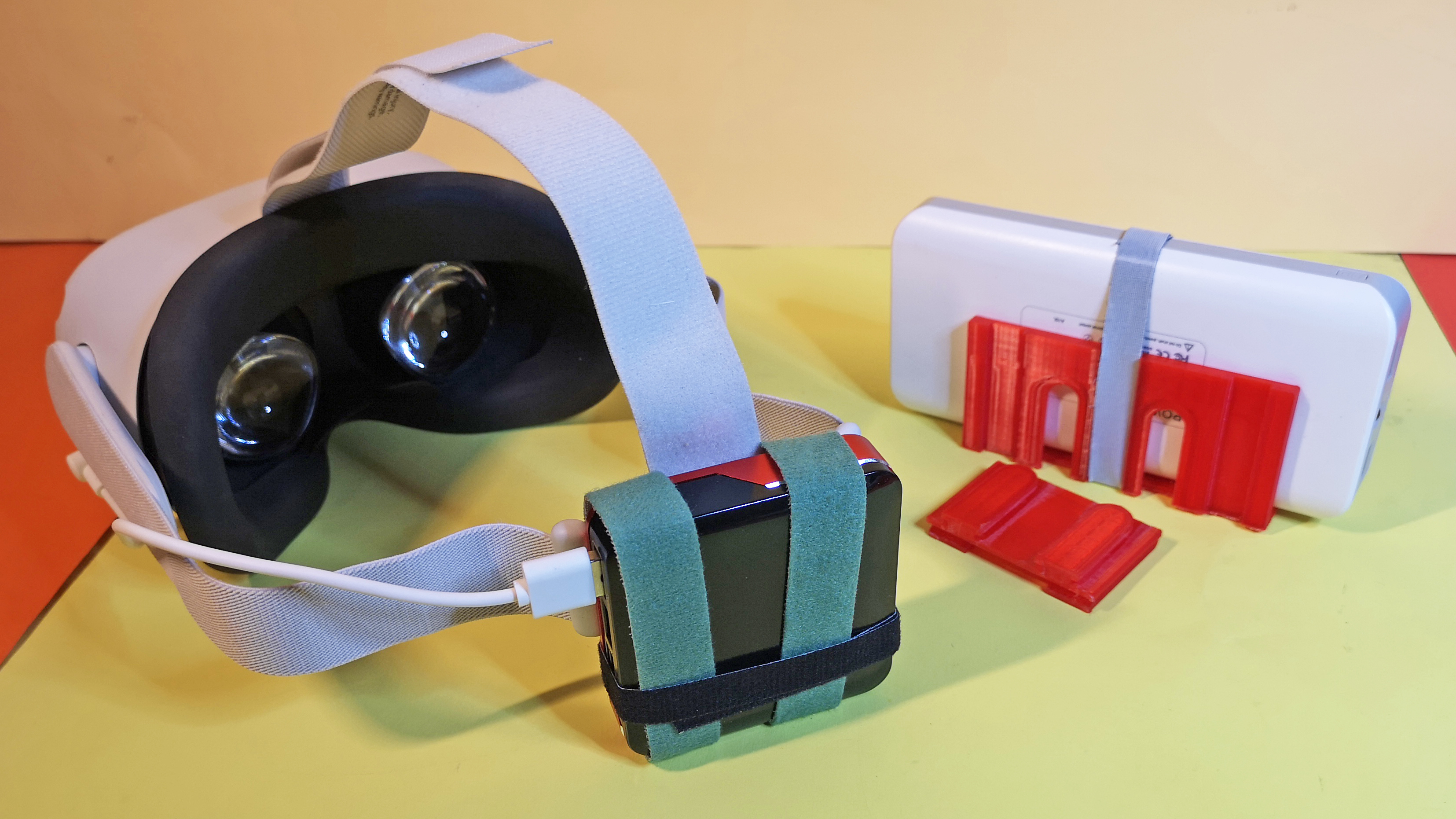 Das haben die Zubehör-Hersteller erkannt und so gibt es zahlreiche mehr oder weniger sinnvolle Speziallösungen. Wer nach den Begriffen Powerbank und Quest 2 bei Amazon sucht, bekommt zum Recherchezeitpunkt über 300 Treffer angezeigt. Hier finden sich etwa extra leichte und sehr kompakte Powerbanks wie das Modell Vakton 4800 mAh für 35 Euro oder die Kapsel-Powerbank von Destek mit 3300 mAh für knapp 27 Euro. Die kleinen Energiespeicher werden zur Nutzung einfach in den USB-C-Anschluss der Quest 2 gesteckt und verlängern die Nutzung um etwa eineinhalb bis zwei Stunden. Verlängerungskabel sind hier nicht nötig. Allerdings kann das zusätzliche, einseitige Gewicht von bis zu 100 g stören und zudem mittelfristig den einzigen USB-Port ausleiern. Bei heftigen Bewegungen während des Zockens, kann diese Lösung außerdem schnell herausfallen. Die direkt ansteckbaren Powerbanks sind aus unserer Sicht nur bei stationärer und ruhiger Nutzung sinnvoll.