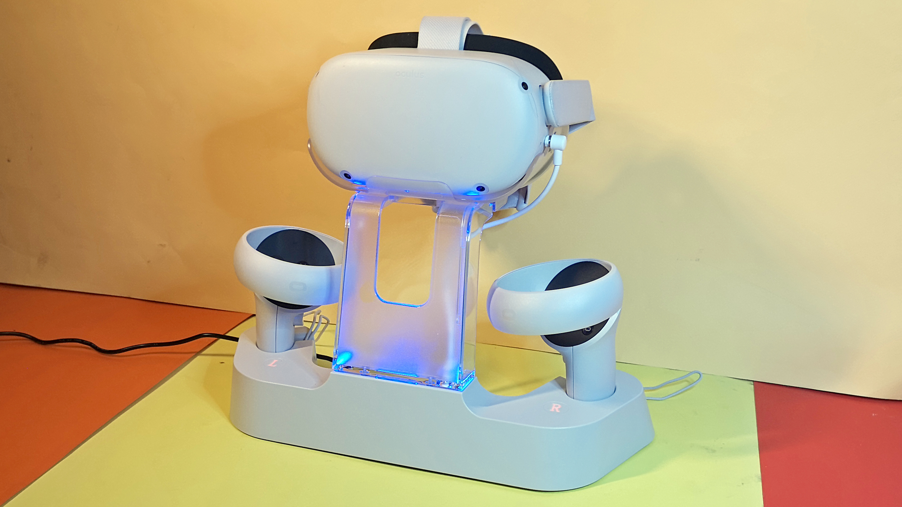 Der Magnetmechanismus kommt auch bei einigen der angebotenen Quest-2-Ladestationen zum Einsatz. Doch hier muss man genau hinsehen, denn bei vielen günstigen Modellen handelt es sich lediglich um eine Halterung mit USB-Anschluss. Das sieht zwar schick aus, erspart aber auch nicht das regelmäßige Auswechseln der Controller-Batterie. Hier sind dann die Ladestationen ab etwa 70 bis 80 Euro interessant. Diese beinhalten eine Halterung mit mehr oder weniger schicker LED-Beleuchtung, ein magnetisches Ladekabel für die Quest und einen Akku-Umbau-Satz für die beiden Controller. Der kleine Bausatz besteht aus einer alternativen Controller-Abdeckung mit kleinen Ladekontakten auf der Unterseite und einem Spezial-Akku. So ausgestattet, können die Controller in den Ladebuchsen der Ladestationen kabellos geladen werden. Mittelfristig schont das die Umwelt und schon Zeit und Nerven. Wer auf das magnetische Ladekabel und die Haltung für die Brille verzichten kann, bekommt Controller-Ladestationen ab etwa 40 Euro.
