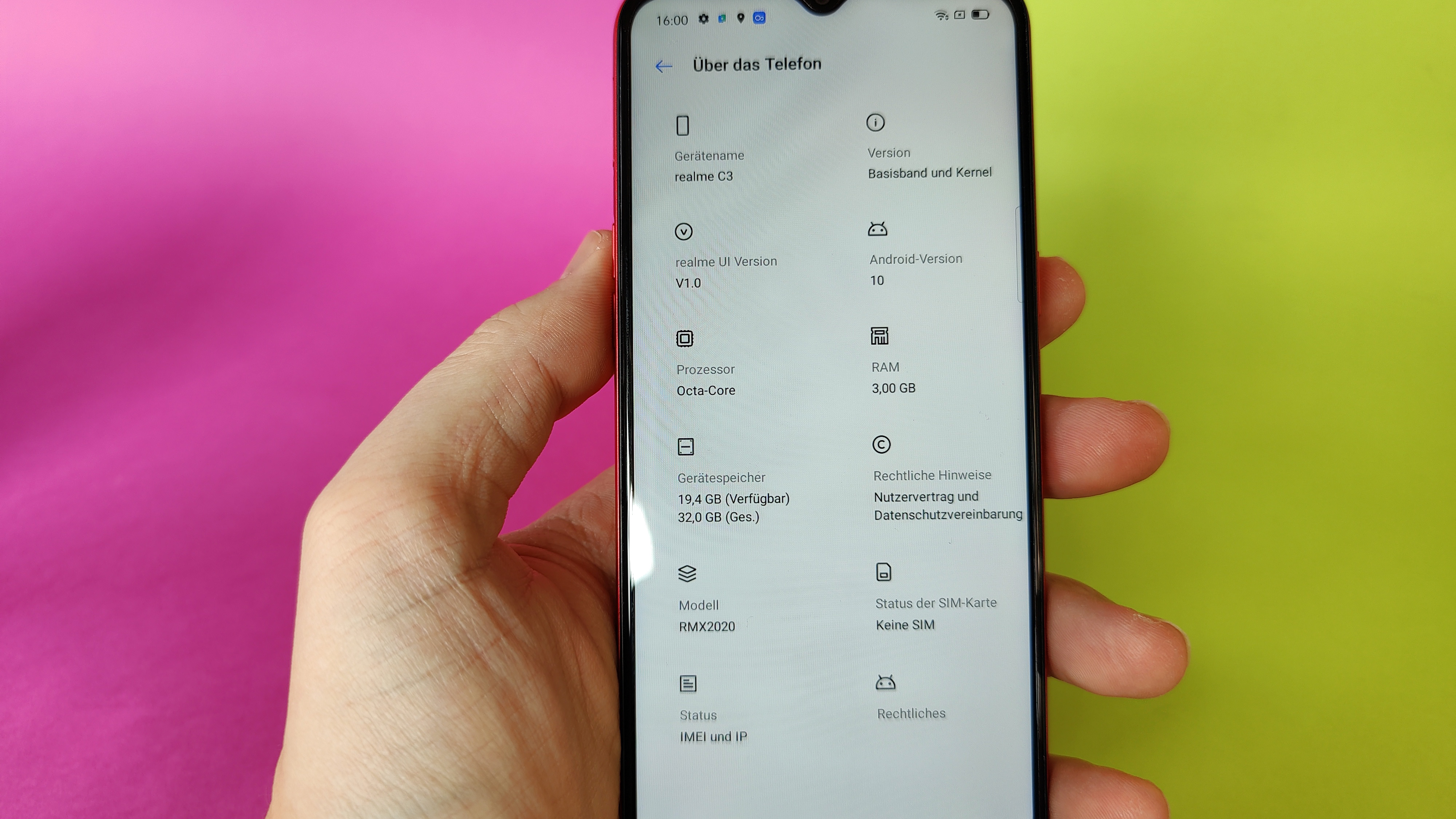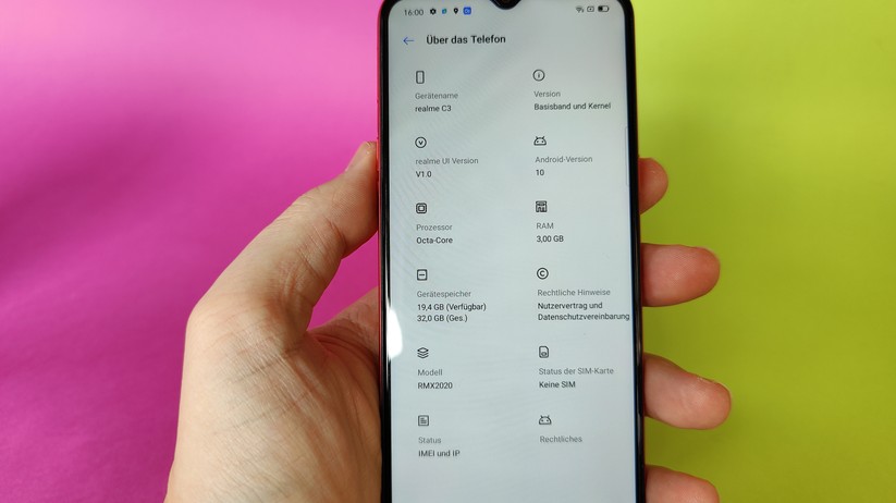 Die restliche Technik ist dem Preis mehr als angemessen: Die Hauptkamera erlaubt Fotos mit 12 Megapixel, f/1.8-Blende und 1,25 µm großen Pixeln, hinzu kommen zwei Objektive mit je 2 Megapixel für Makro- und Portraitaufnahmen. Das Ortungsmodul kommuniziert mit GPS-, Glonass- und Beidou-Satelliten, außerdem gibt es WLAN n, Bluetooth 5.0 und LTE. Der Fingerabdrucksensor auf der Rückseite ist etwas zu hoch positioniert. Größtes Manko: Weder NFC noch USB C haben es in das Realme C3 geschafft, stattdessen setzt der Hersteller auf Micro-USB – das passt nicht mehr ins Jahr 2020. Immerhin schluckt das günstige Smartphone zwei SIM-Karten und eine Micro-SD gleichzeitig. Als Betriebssystem kommt Android 10 mit darüber liegender, recht schlanker Realme-UI 1.0 zum Einsatz. Störend: Der Hersteller installierte auf unserem Testgerät mehrere Bloat-Apps.