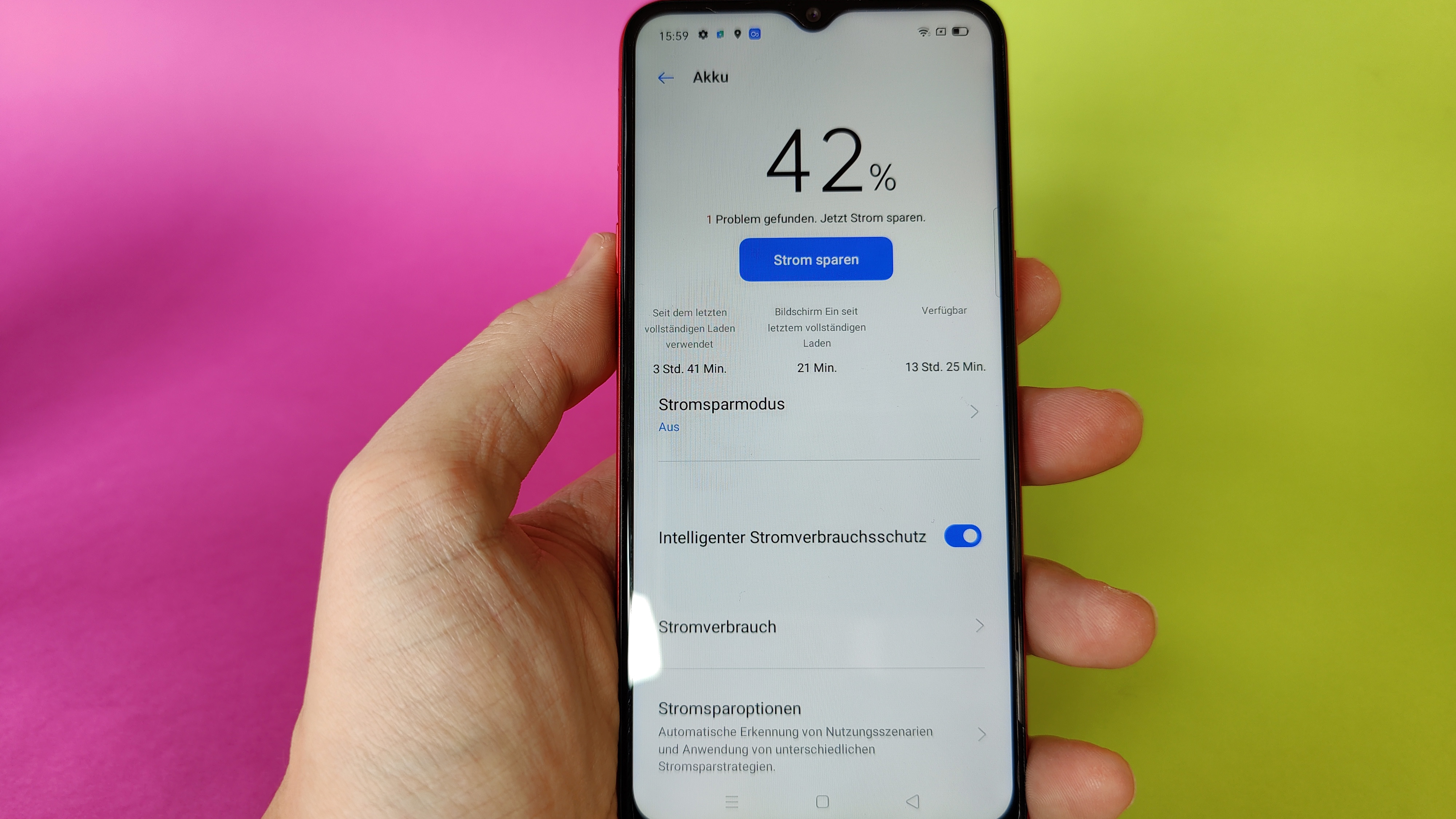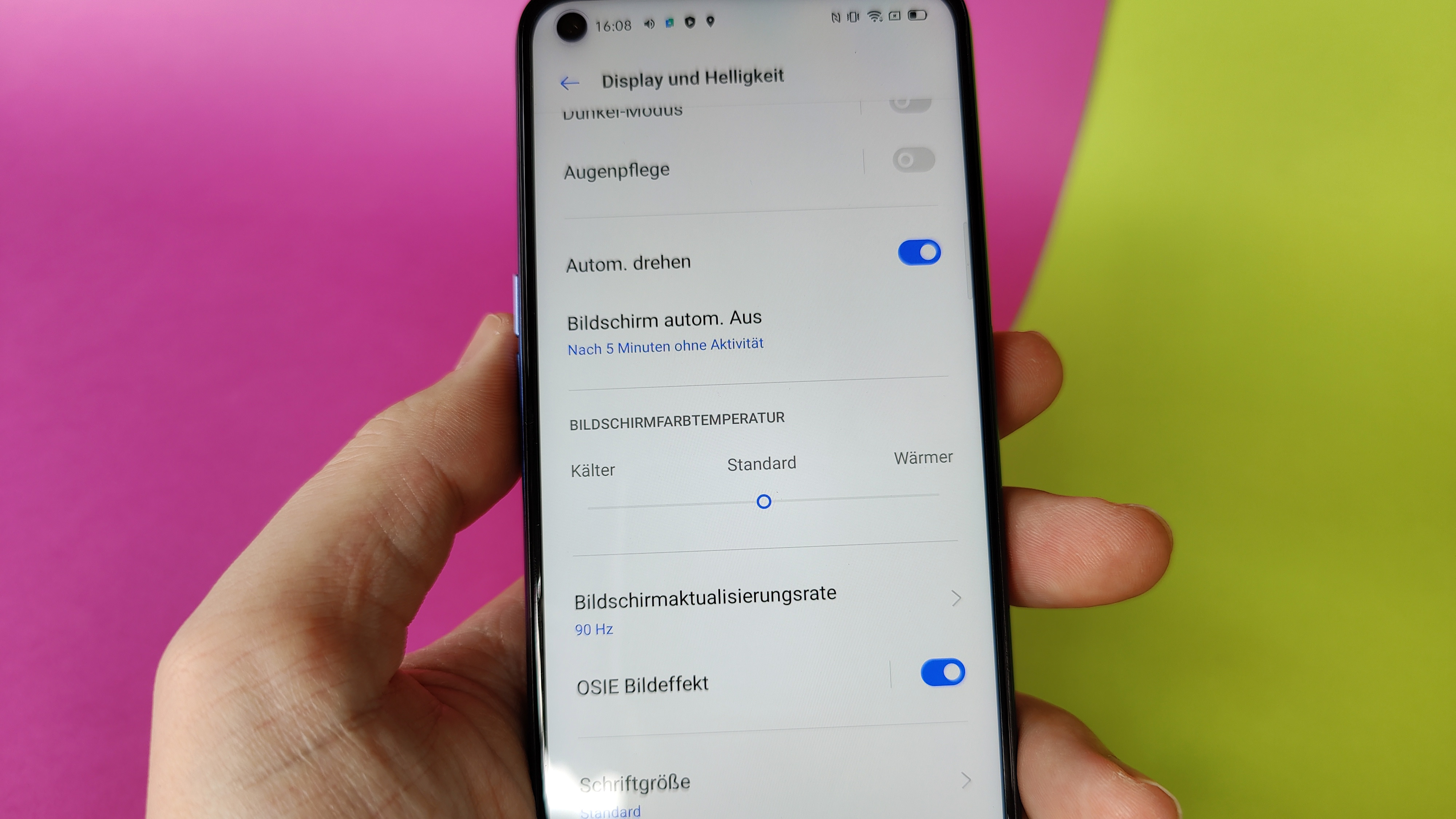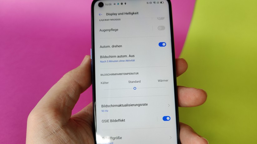 Optisch gefällt uns das Gerät sehr gut. Zwar sind Rahmen und Rückseite aus Kunststoff, beides wirkt dennoch ausreichend hochwertig und geht auf den ersten Blick als Metall und Glas durch. Schick ist auch der Farbverlauf von Graugrün zu Lila, allerdings zieht die glänzende, glatte Oberfläche Fingerabdrücke magisch an. Abhilfe schafft hier eine passende Schutzhülle, die auch beim 6i dabei ist. Die Bedienung stellte sich nach anfänglichen Problemen bei der Performance und erneutem Zurücksetzen als tadellos heraus, ein Unterschied von 60 zu 90 Hz ist klar zu erkennen. Allein das beim ersten Ausprobieren helle, kontrastreiche und vor allem in der Darstellung sehr flüssige 90-Hz-Display macht das Realme 6 in seiner Klasse zum Kandidaten für den Preis-Leistungs-Thron.