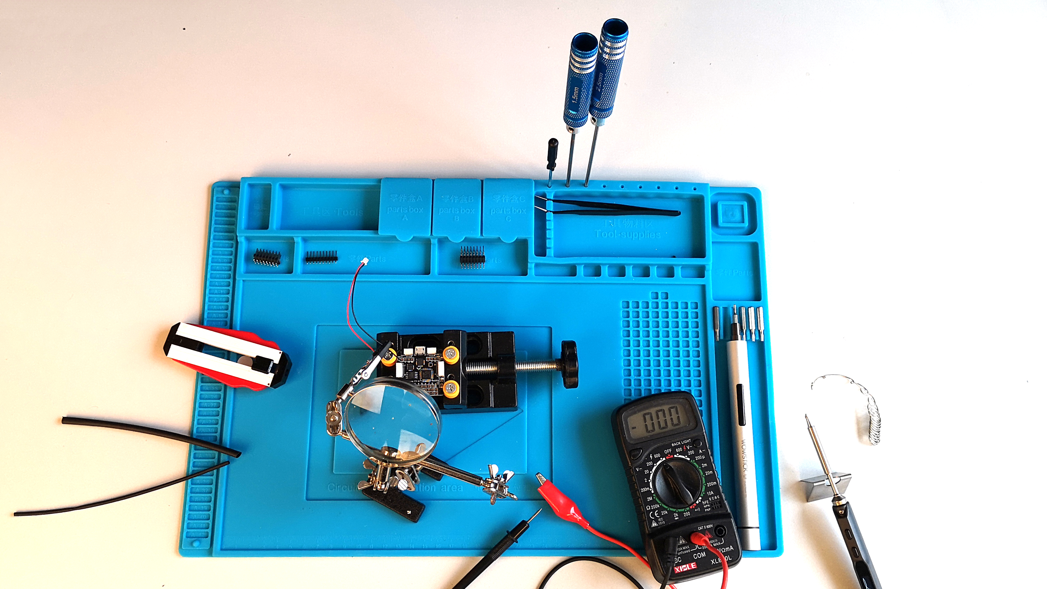 Die Baby-blaue Matte ist hitzebeständig bis zu 500 Grad Celsius und verfügt über verschiedene Fächer, Ablagemöglichkeiten und magnetische Bithalter. Durch die Vertiefungen und Ablagefächer geht bei Reparaturen und Selbstbauten keine Schraube mehr verloren. Ein weiterer Vorteil des Materials: Selbst extrem gut haftendes Epoxidharz kann nach dem Trocknen ganz einfach wieder entfernt werden.