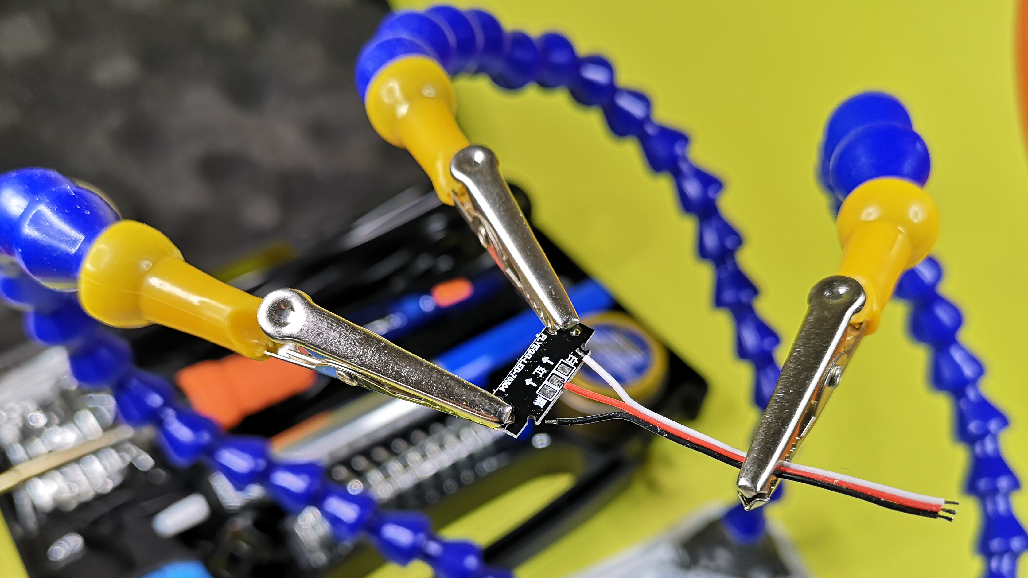 Nicht nur für filigrane Lötarbeiten ist die Investition in eine sogenannte dritte Hand sinnvoll. Diese Klemmvorrichtungen fixieren Kabel und Werkstück für den Bastler. Das klassische Metallmodell mit zwei Haltearmen und Lupe kostet nur etwa 7 Euro. Noch deutlich praktischer sind die etwas teureren Modelle mit mehr flexiblen Armen und integriertem LED-Licht oder Lupenfunktion. Die Varianten mit Klemmvorrichtung für die Tischplatte sind erfahrungsgemäß etwas stabiler, aber dafür weniger flexibel, als die frei platzierbaren Varianten.