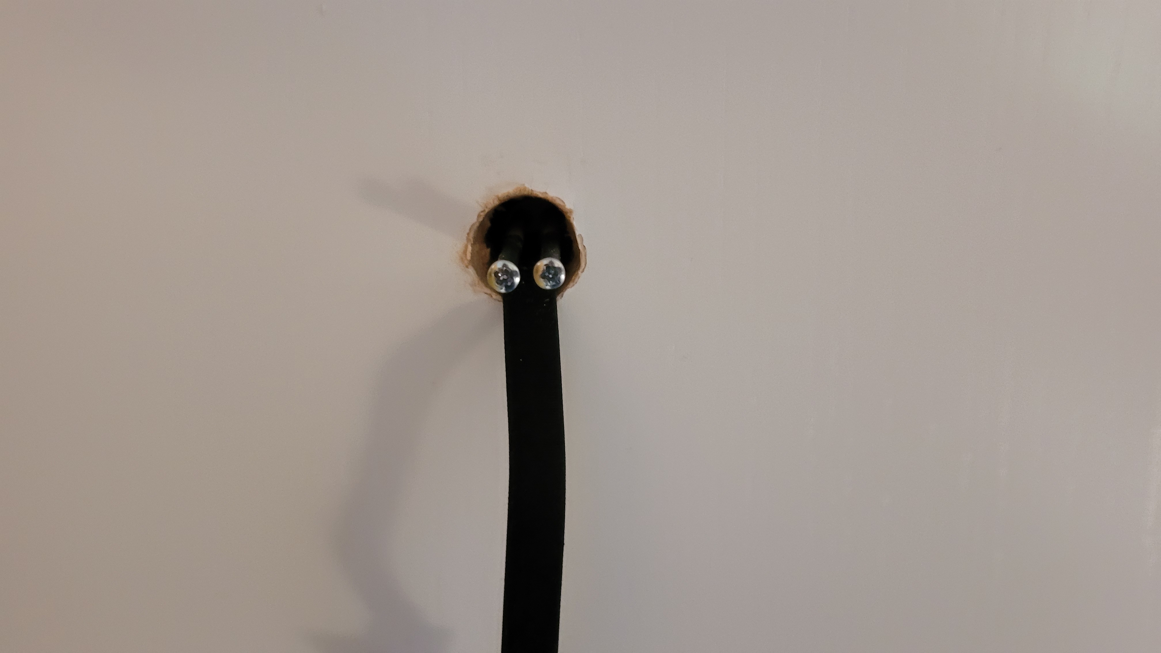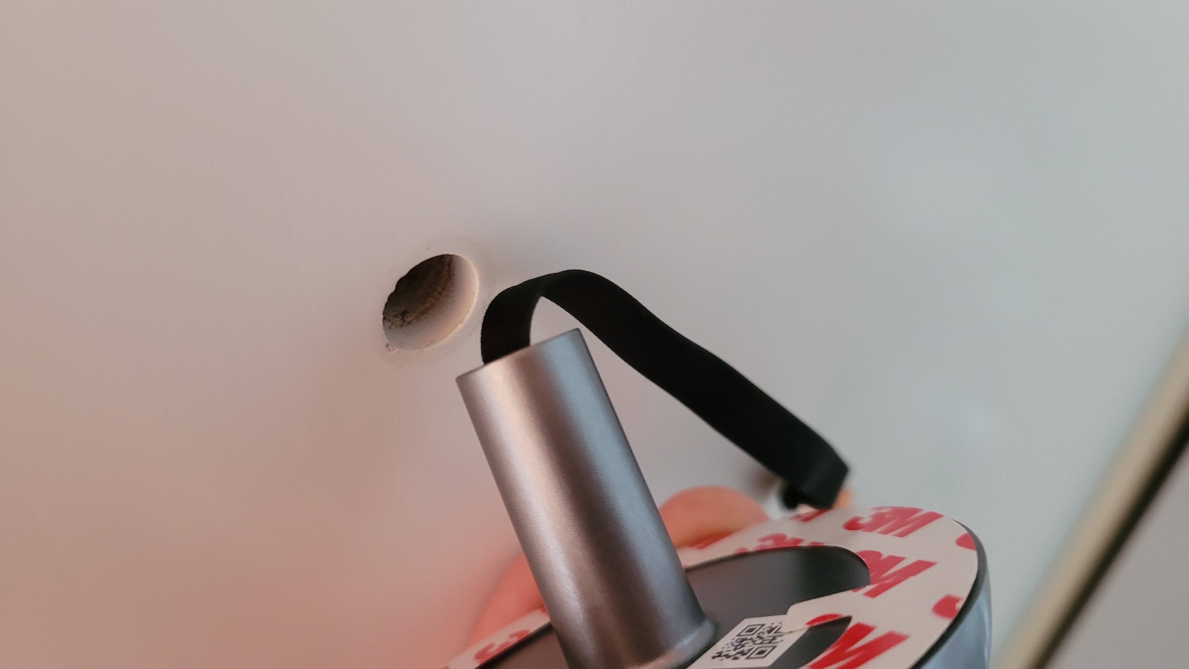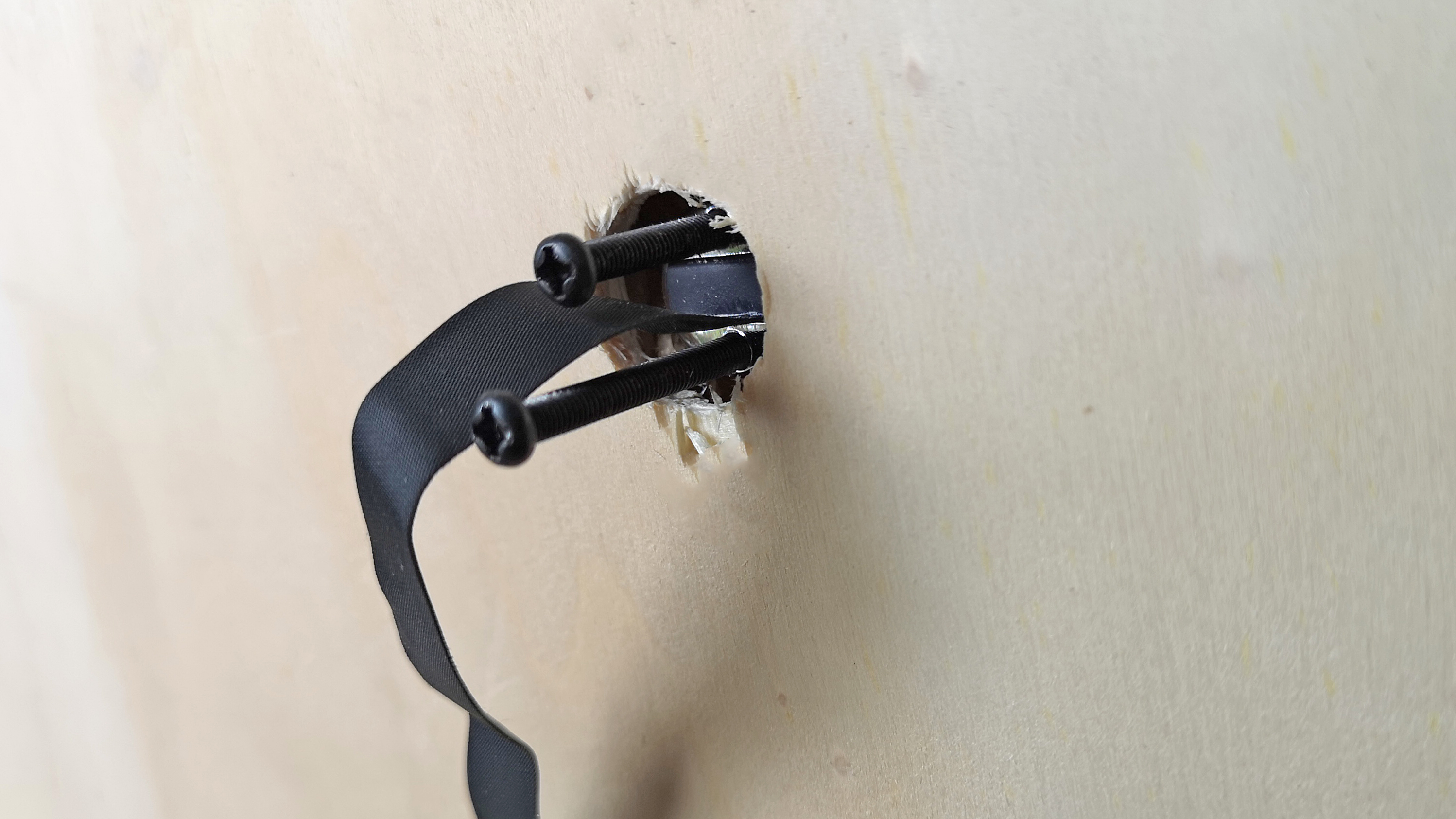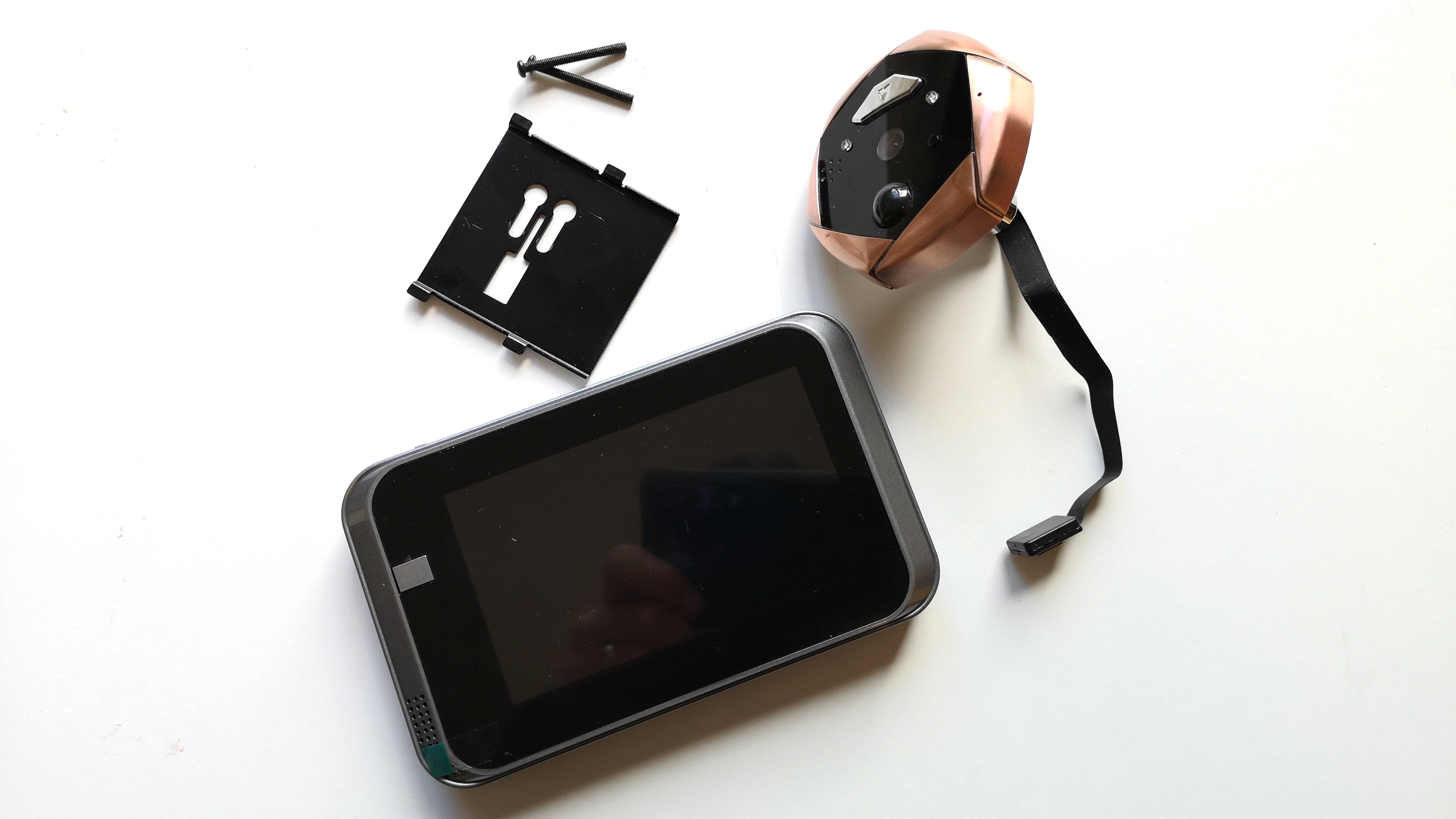 Zurück bleibt ein Loch in der Tür. In dieses steckt man von der Außenseite die Linse mit dem Kabel und dem Tubus. Um die Kameraeinheit gegen versehentliches Verdrehen beim Einbau zu sichern, kommt doppelseitiges Klebeband zum Einsatz. Nach dem Einstecken und Festkleben des Moduls folgt die Montage der Monitor-Halterung. Diese wird von der Türinnenseite zweifach mit dem Tubus der Außenkamera verschraubt und ebenfalls mit doppelseitigem Klebeband fixiert. Je nach Dicke der Tür kommen dazu unterschiedlich lange Schrauben des Lieferumfangs zum Einsatz. Wer eine sehr dünne oder äußerst dicke Tür verwendet, muss aufpassen. Nicht alle Türspione sind für alle Türdicken geeignet.