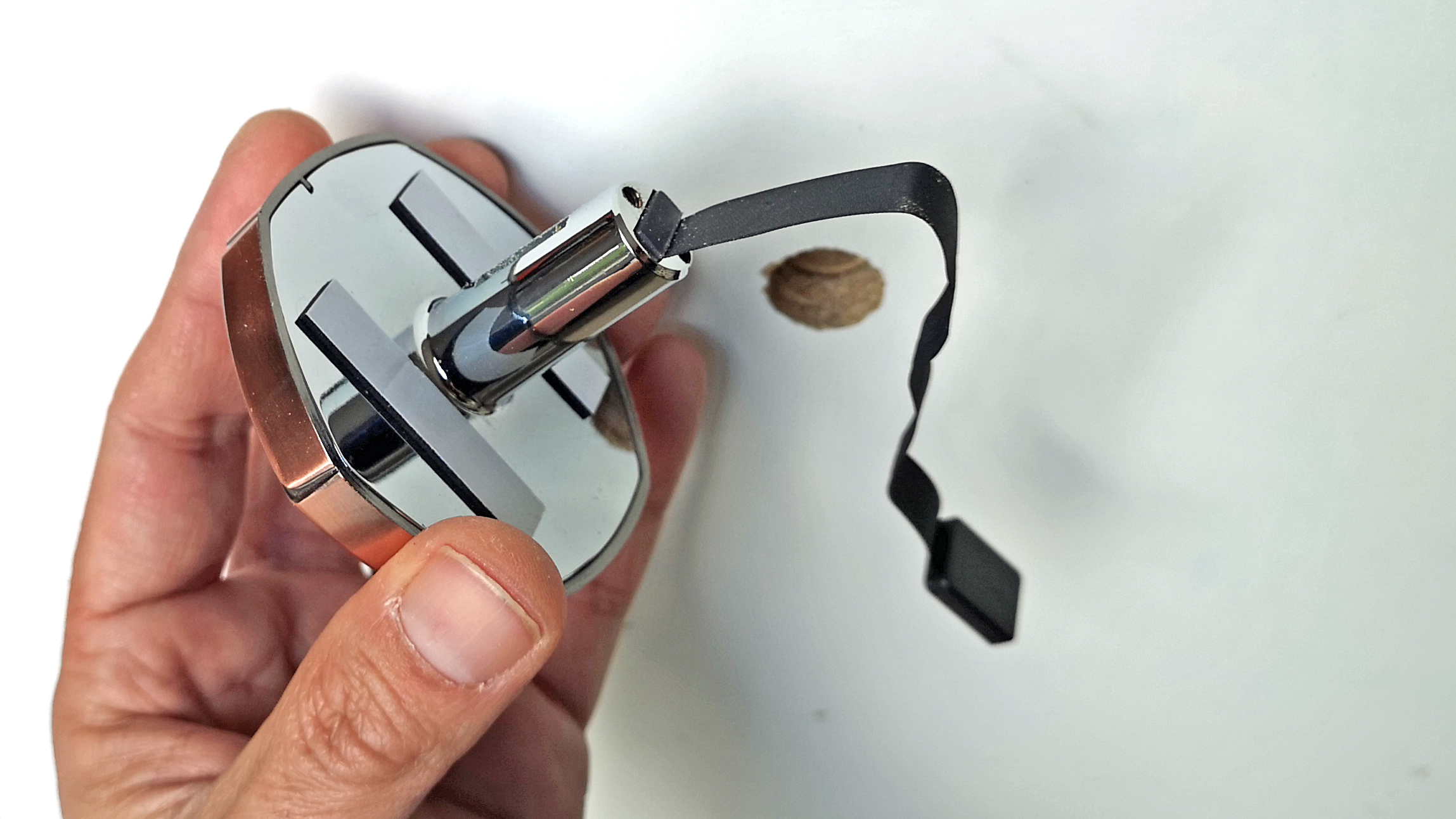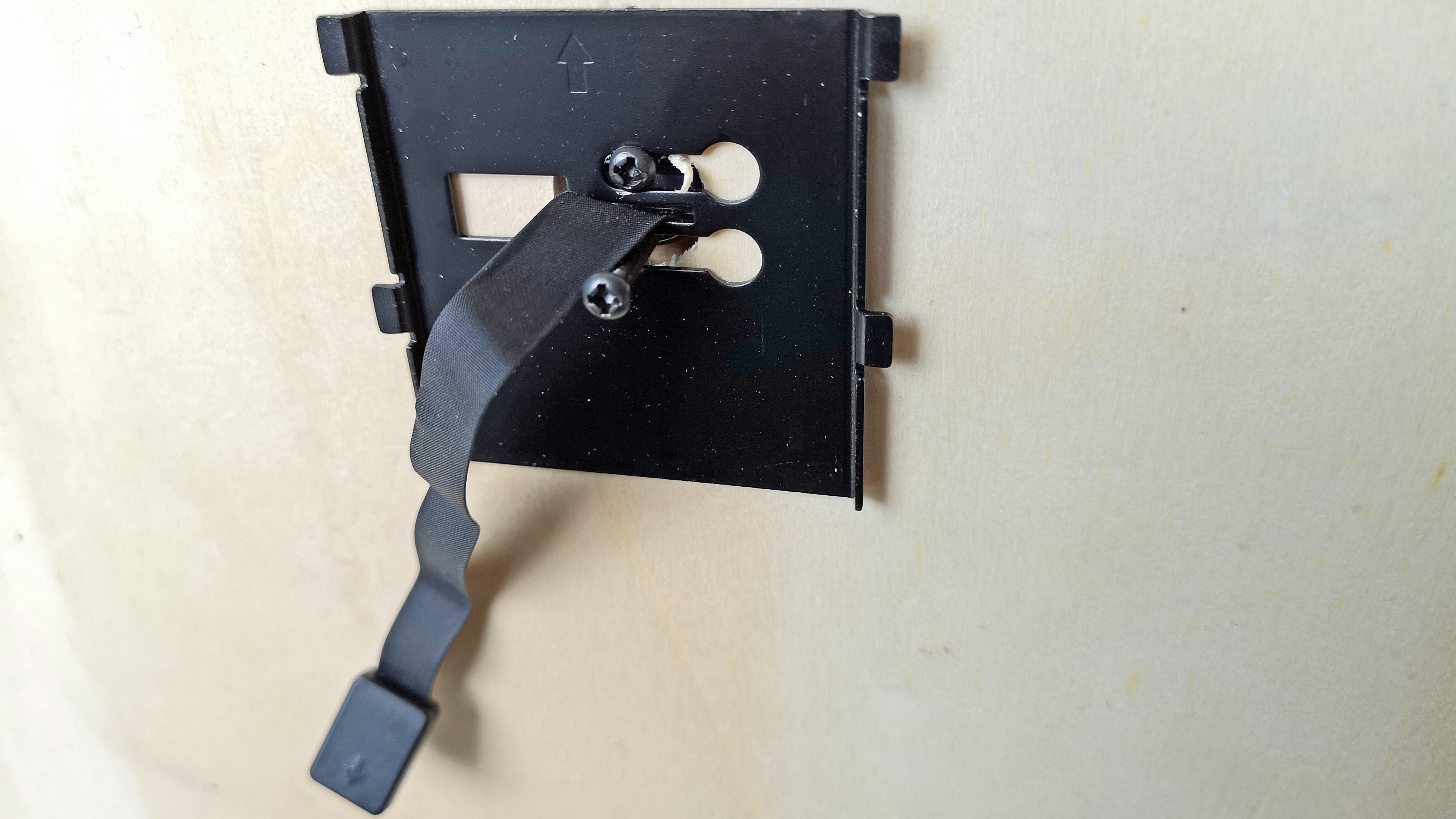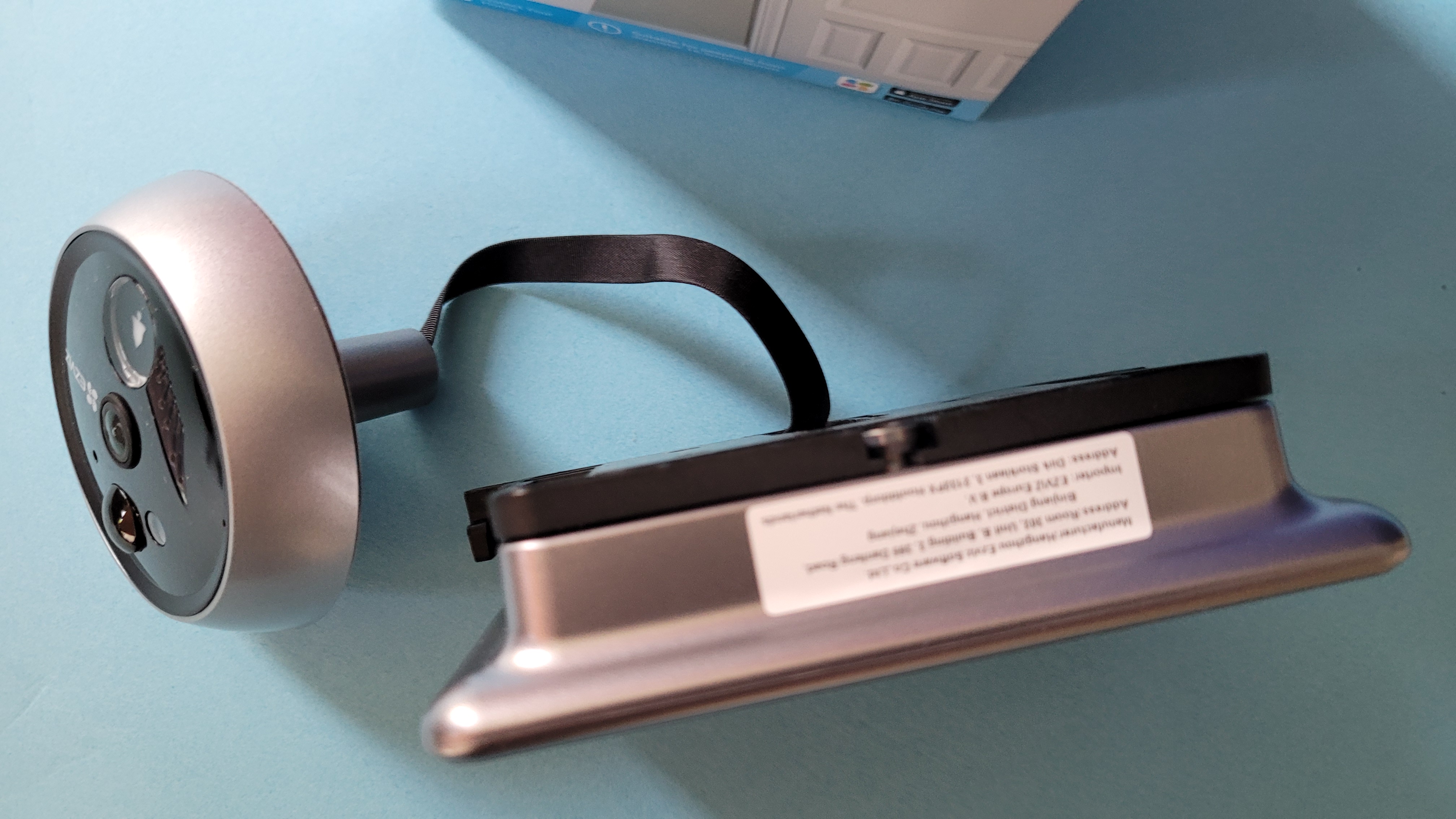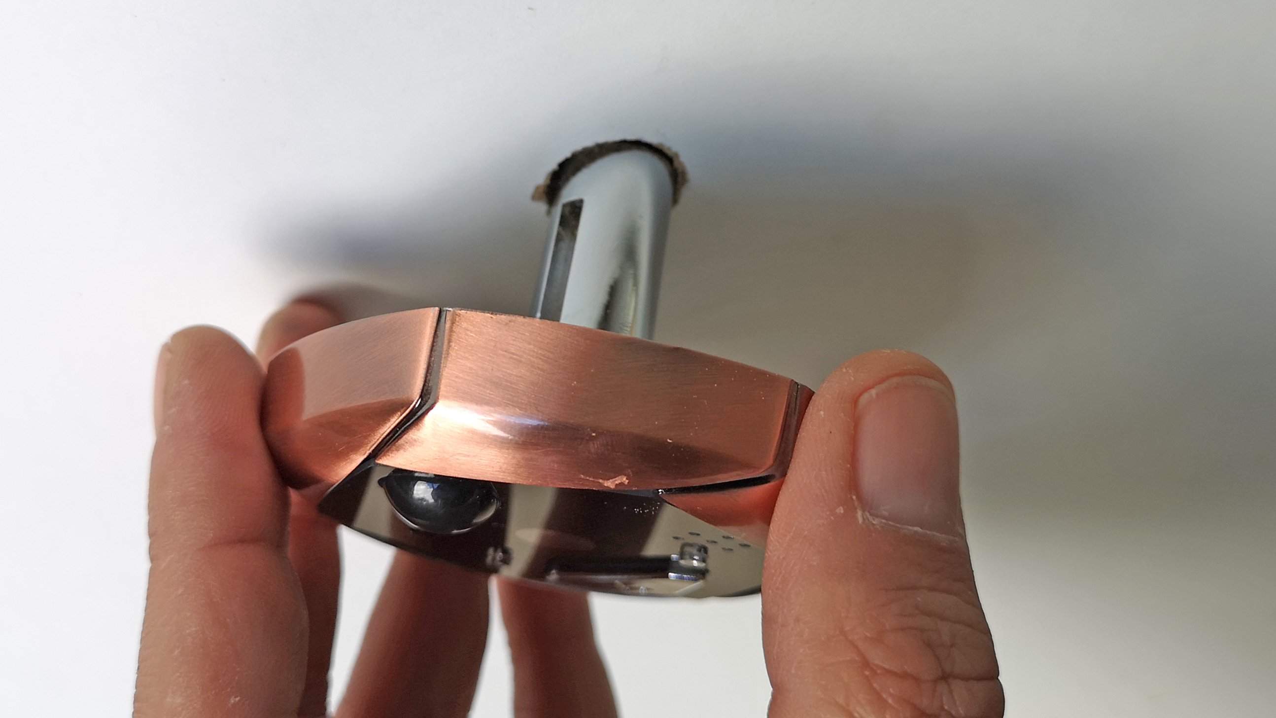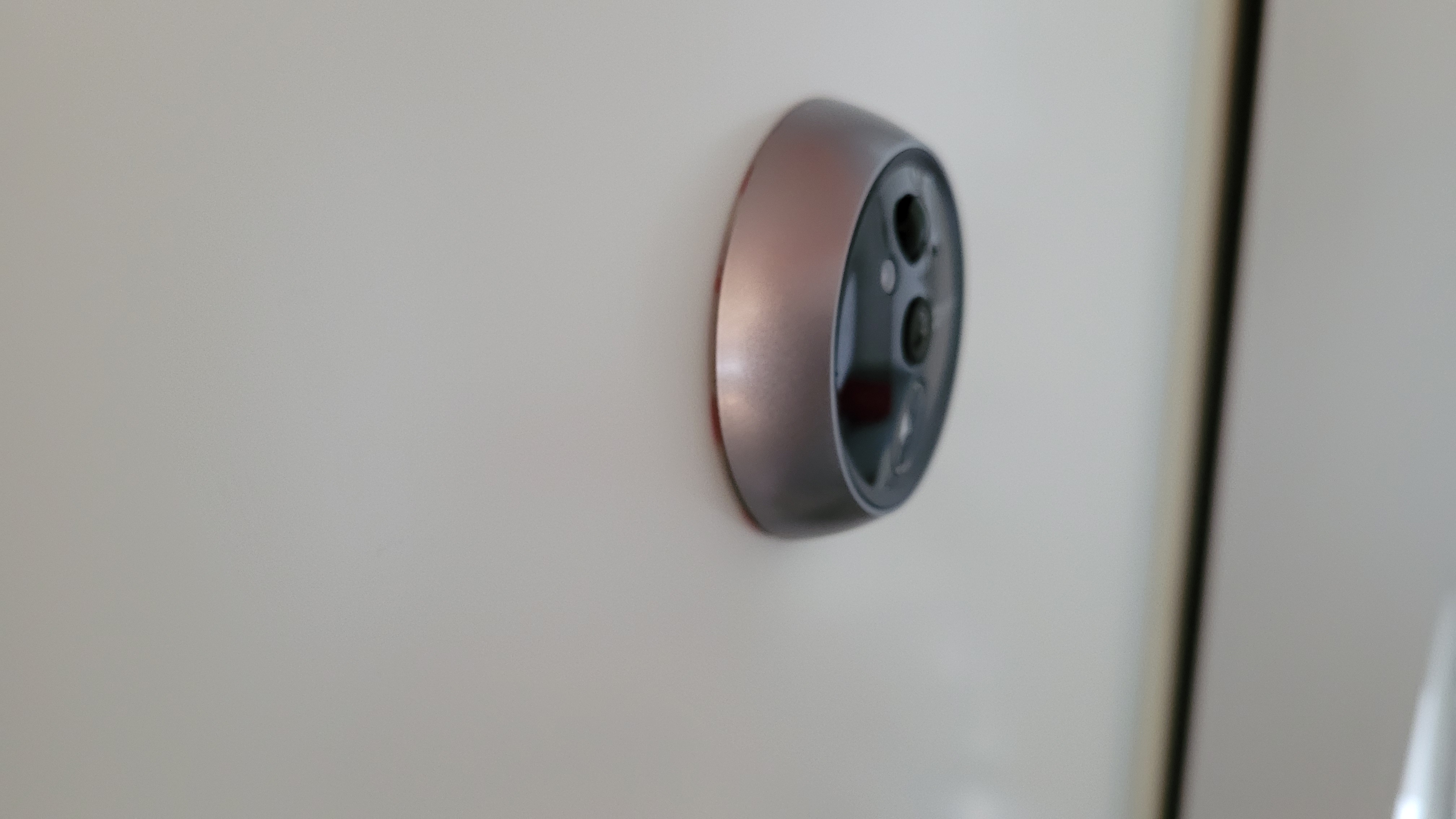 Zurück bleibt ein Loch in der Tür. In dieses steckt man von der Außenseite die Linse mit dem Kabel und dem Tubus. Um die Kameraeinheit gegen versehentliches Verdrehen beim Einbau zu sichern, kommt doppelseitiges Klebeband zum Einsatz. Nach dem Einstecken und Festkleben des Moduls folgt die Montage der Monitor-Halterung. Diese wird von der Türinnenseite zweifach mit dem Tubus der Außenkamera verschraubt und ebenfalls mit doppelseitigem Klebeband fixiert. Je nach Dicke der Tür kommen dazu unterschiedlich lange Schrauben des Lieferumfangs zum Einsatz. Wer eine sehr dünne oder äußerst dicke Tür verwendet, muss aufpassen. Nicht alle Türspione sind für alle Türdicken geeignet.