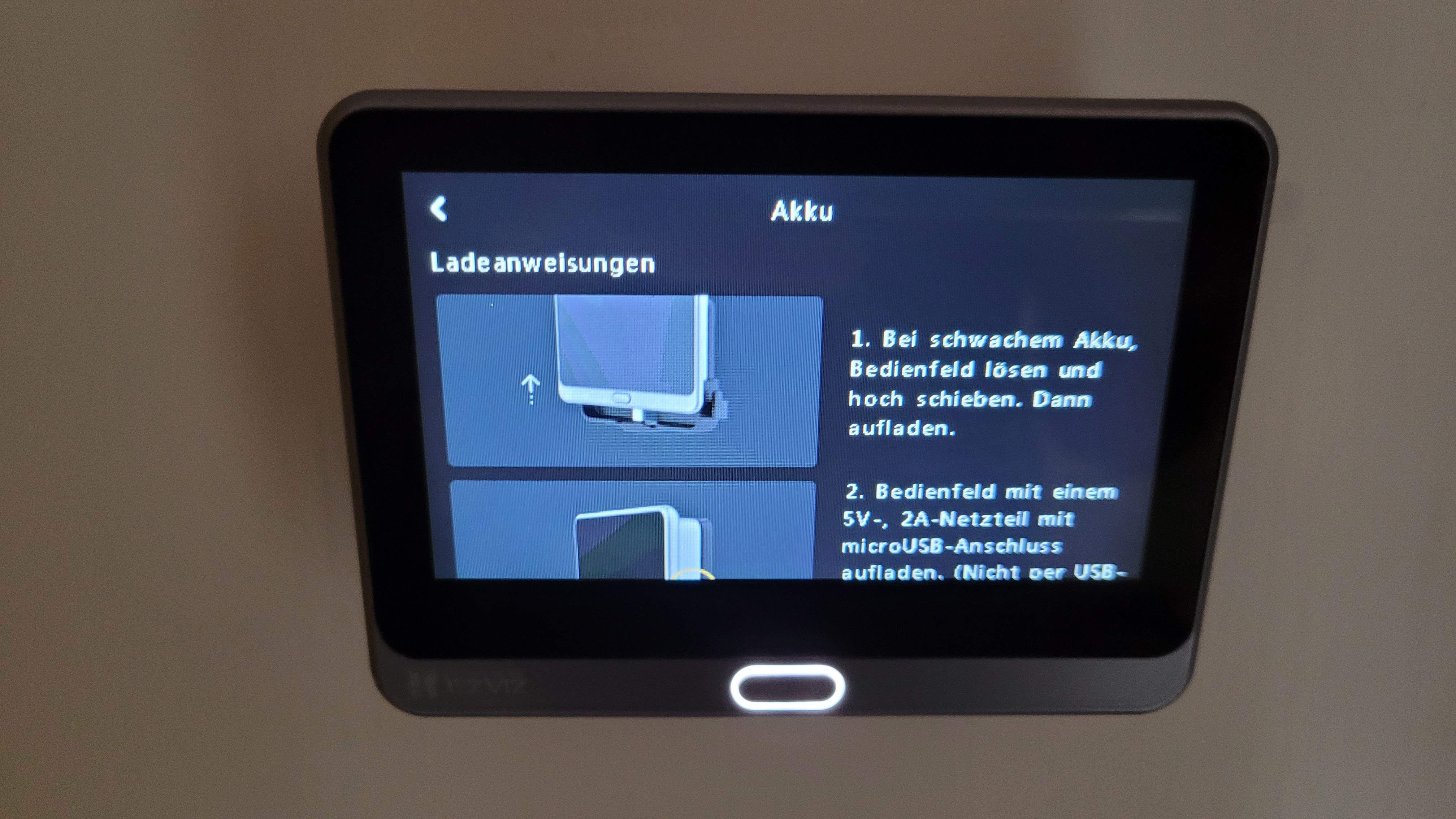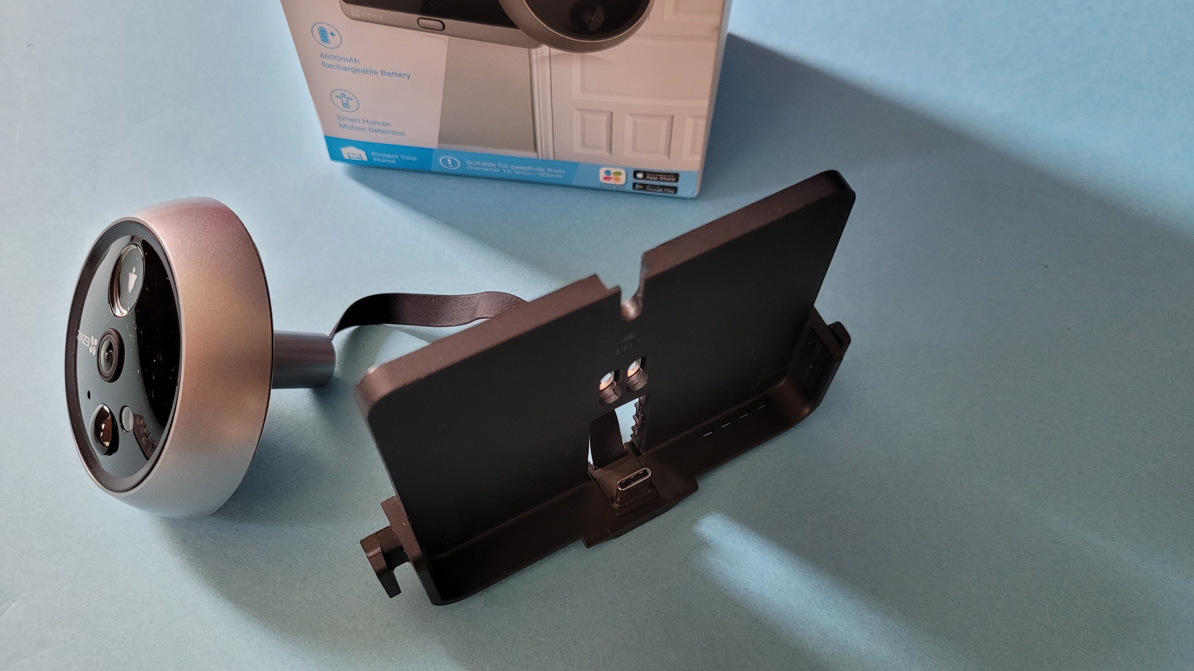 Nach der Montage des Monitors der Wireless Peephole Video Doorbell fällt uns auf, dass der integrierte Akku leer ist. Um ihn zu laden, benötigen wir ein Micro-USB-Kabel und eine Stromquelle. Das klingt einfach, ist aber nur mit passender Ausstattung möglich. Wer keine Steckdose neben der Tür hat, muss den Monitor entweder von der Kamera trennen und in einem anderen Zimmer aufladen oder eine Powerbank benutzen. Wir benutzen eine USB-Powerbank und ein eigenes Kabel. Das beigelegte Kabel ist für unser Vorhaben mit nur 30 Zentimetern viel zu kurz.